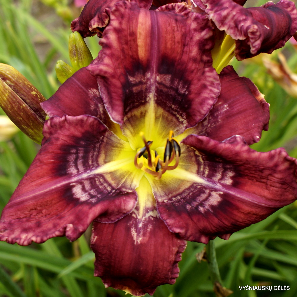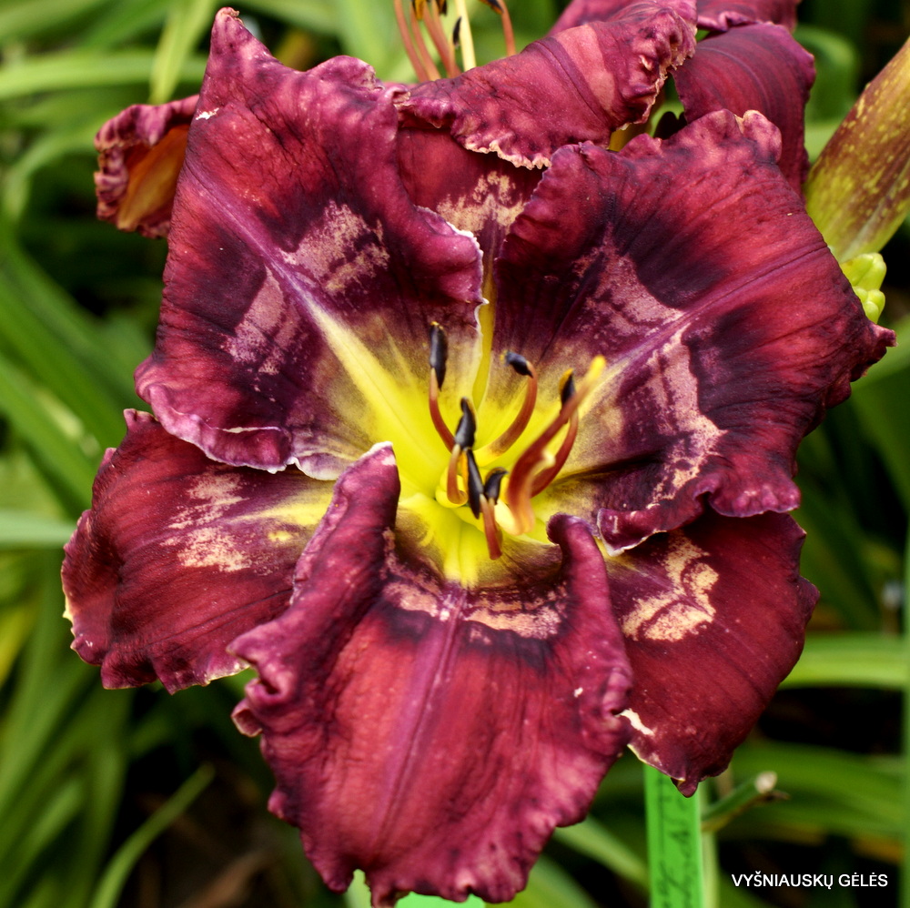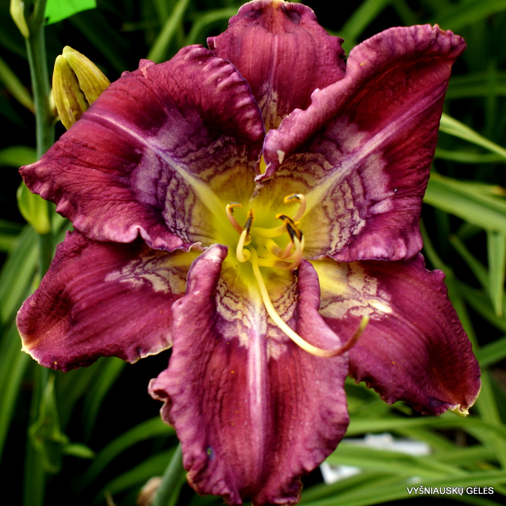 Žiedai dideli (19 cm skersmens) tamsiai purpuriniai su daugiaspalviu margu centru. A – 80 cm