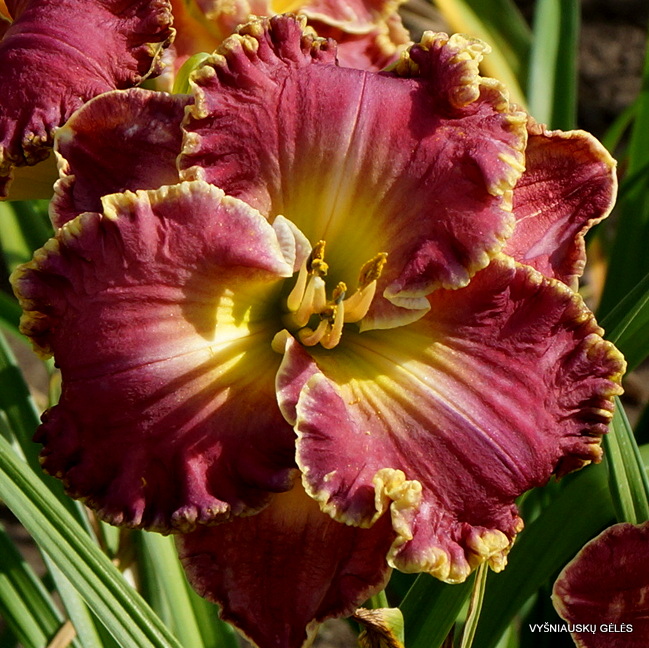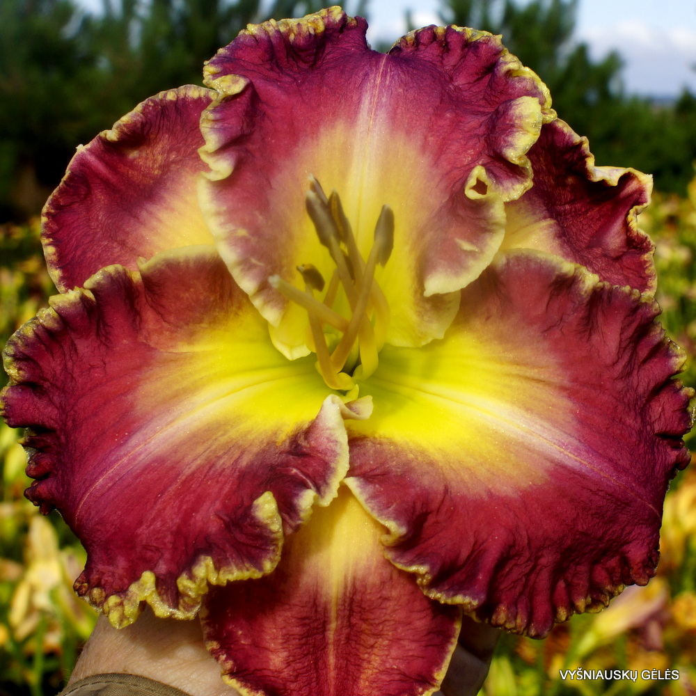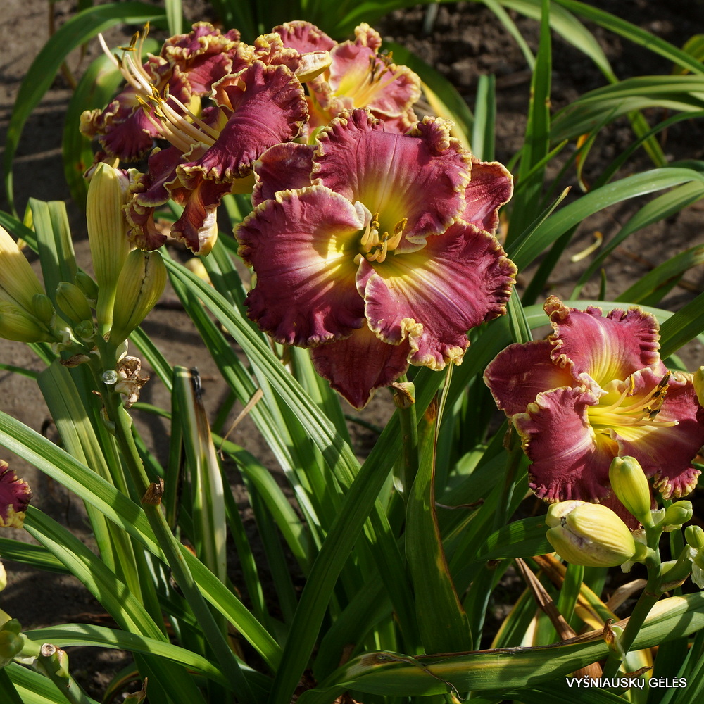Žiedai 14 cm skersmens, avietiškai rožiniai su žaliu centru ir šviesesniu vandenženkliu. Gana turi reljefiškumo. Pakraščiai geltoni, garbanoti.Žiedynas 3 kartus šakotas su 20 pumpurų. veislė vidutinio ankstyvumo, gerai mezganti sėklas. A – 50-60 cm