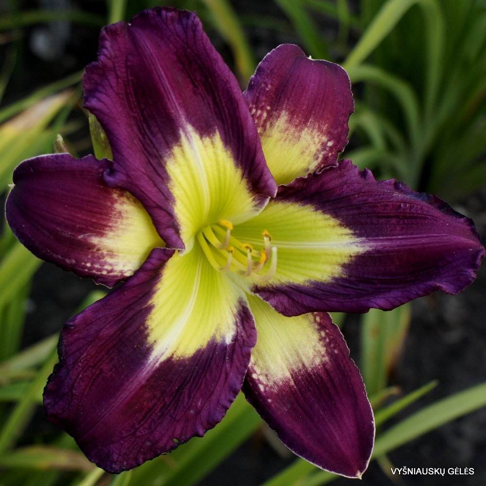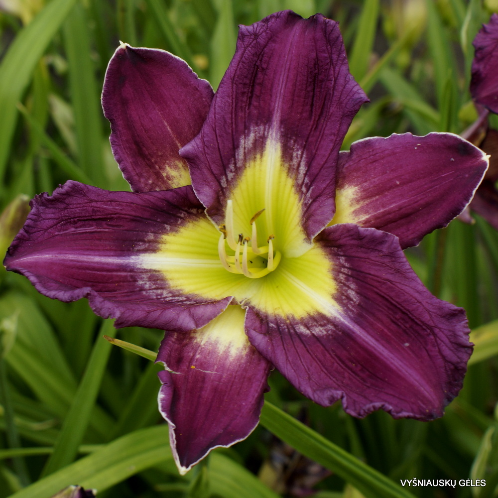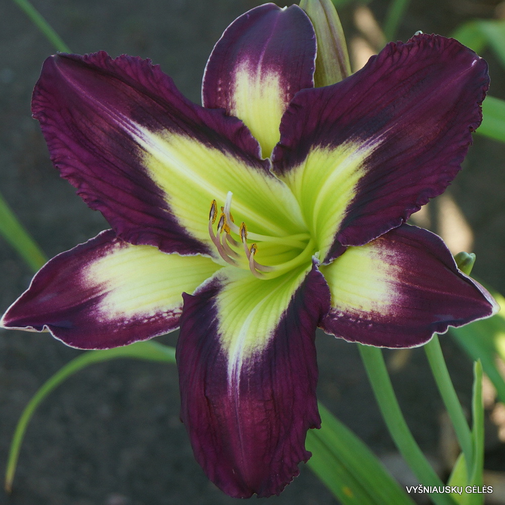 Žiedai 13 cm skersmens, sodrios slyvų raudonumo spalvos su dideliu trikampiu žaliu centru, apjuostu tamsesne akimi. Žiedynas 4 kartus šakotas su 27 pumpurais, taip pat leidžia pakartotinius žiedynus ant kurių dažnai pasirodo žiedų su papildomu vainiklapiu. A – 75 cm