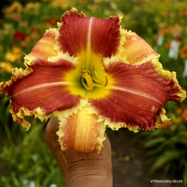 Žiedai 18 cm skersmens, ryškiai rožiniai su labai užsirietusiais taurėlapiais ir vainiklapiais ant kurių galų ypač plačios garbanos su labai dideliais geltonais dantimis, nagais ir čiuptuvais. Dėl šio požymio ir kilo pavadinimas, kurį išvertus reiškia – Skrendantis Šikšnosparnis. Vainiklapių galų nagai simbolizuoja šikšnosparnio kojų nagus. A – 110 cm