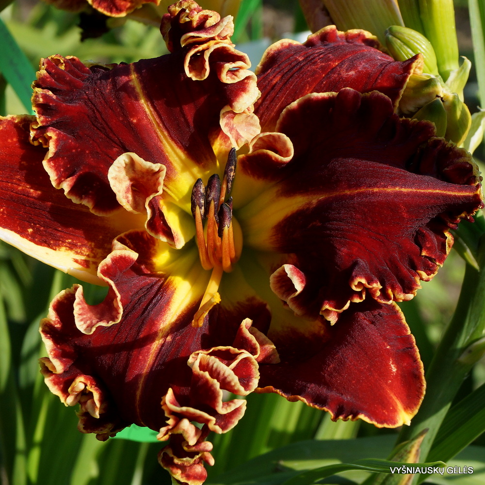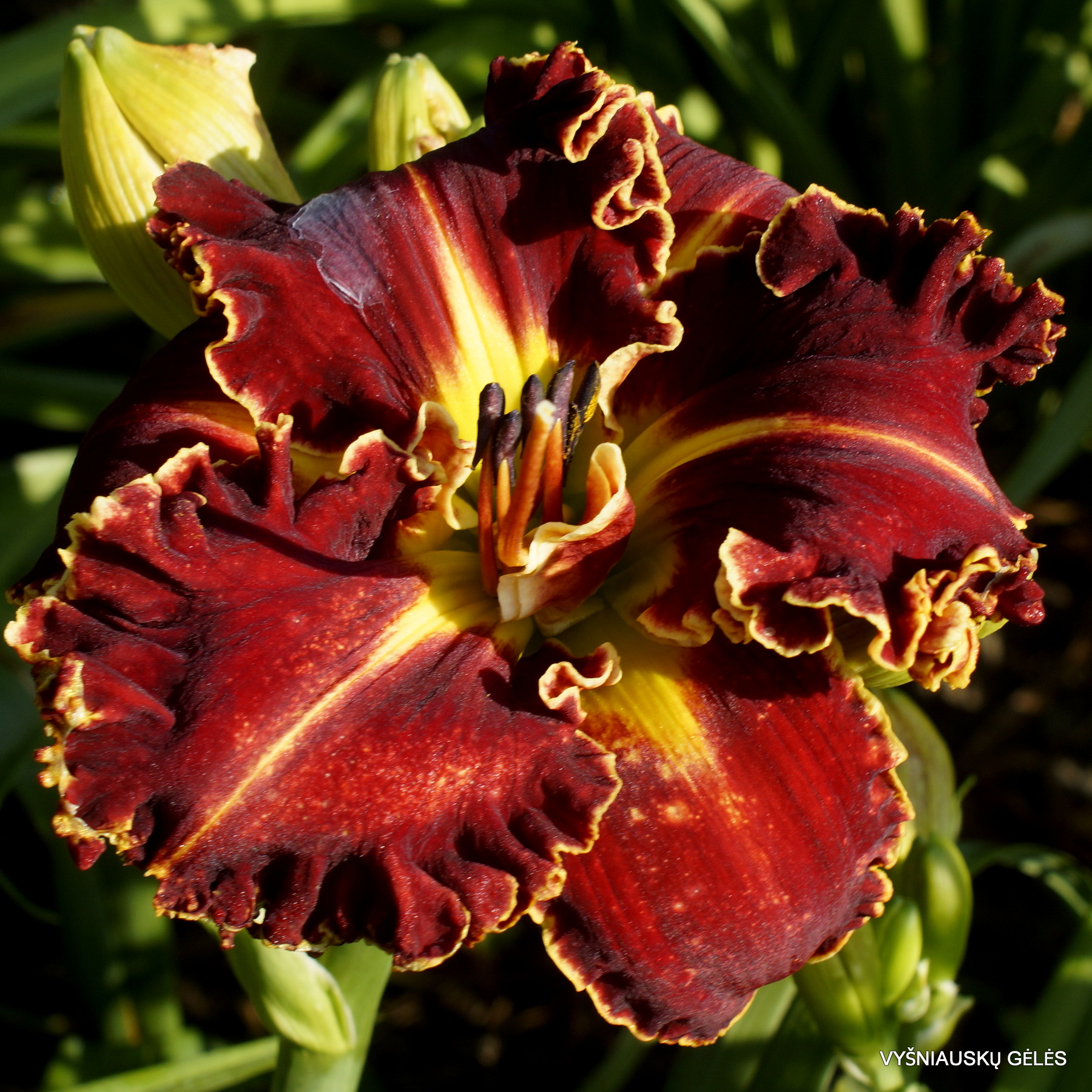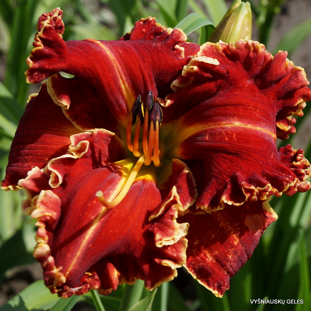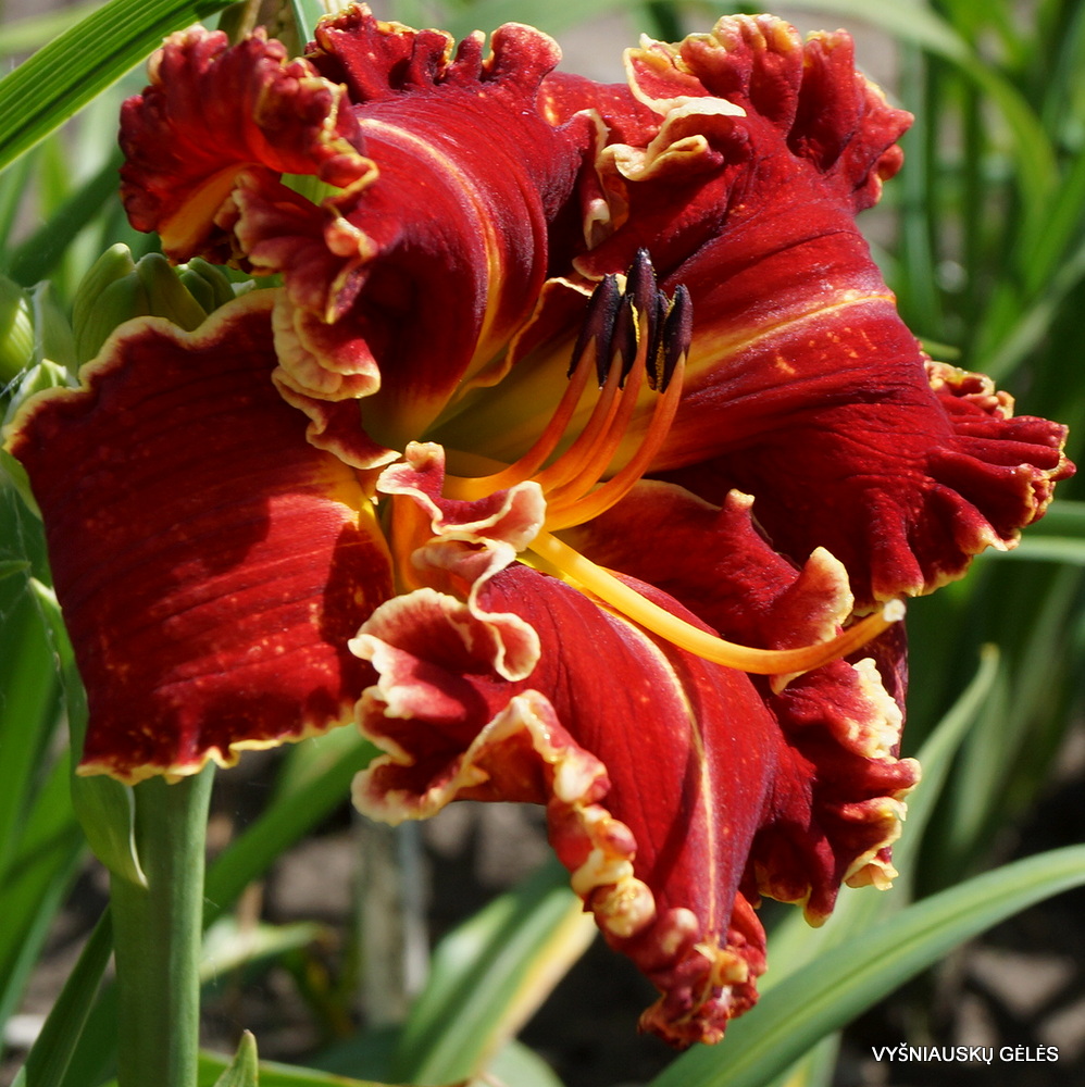 Žiedai 16 cm skersmens, skulptūriniai klostėti, labai sodrios ryškiai raudonos spalvos su labai plačiais stipriai garbanotais pakraščiais su baltu apvadu. Registruota kad žiedynstiebis 3 kartus šakotas su 22 pumpurais, bet realiai yra 5-7 kartus šakotas ir iki 40 pumpurų. Veislė vidutinio ankstyvumo. Labai gerai mezga sėklas. A – 70 cm