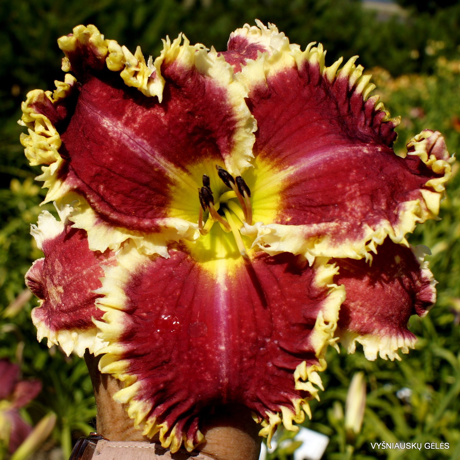 Žiedai vidutinio dydžio (15 cm skersmens) tamsaus vyno raudonumo su baltais ir gelsvais  spygliais.