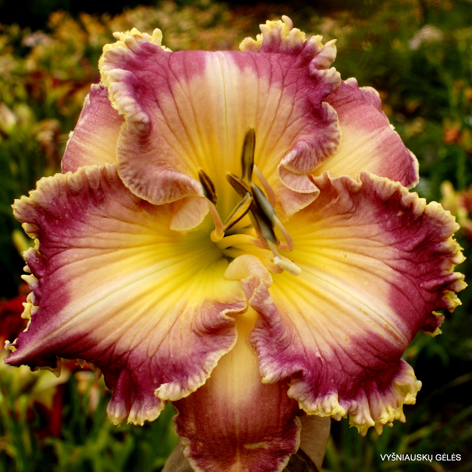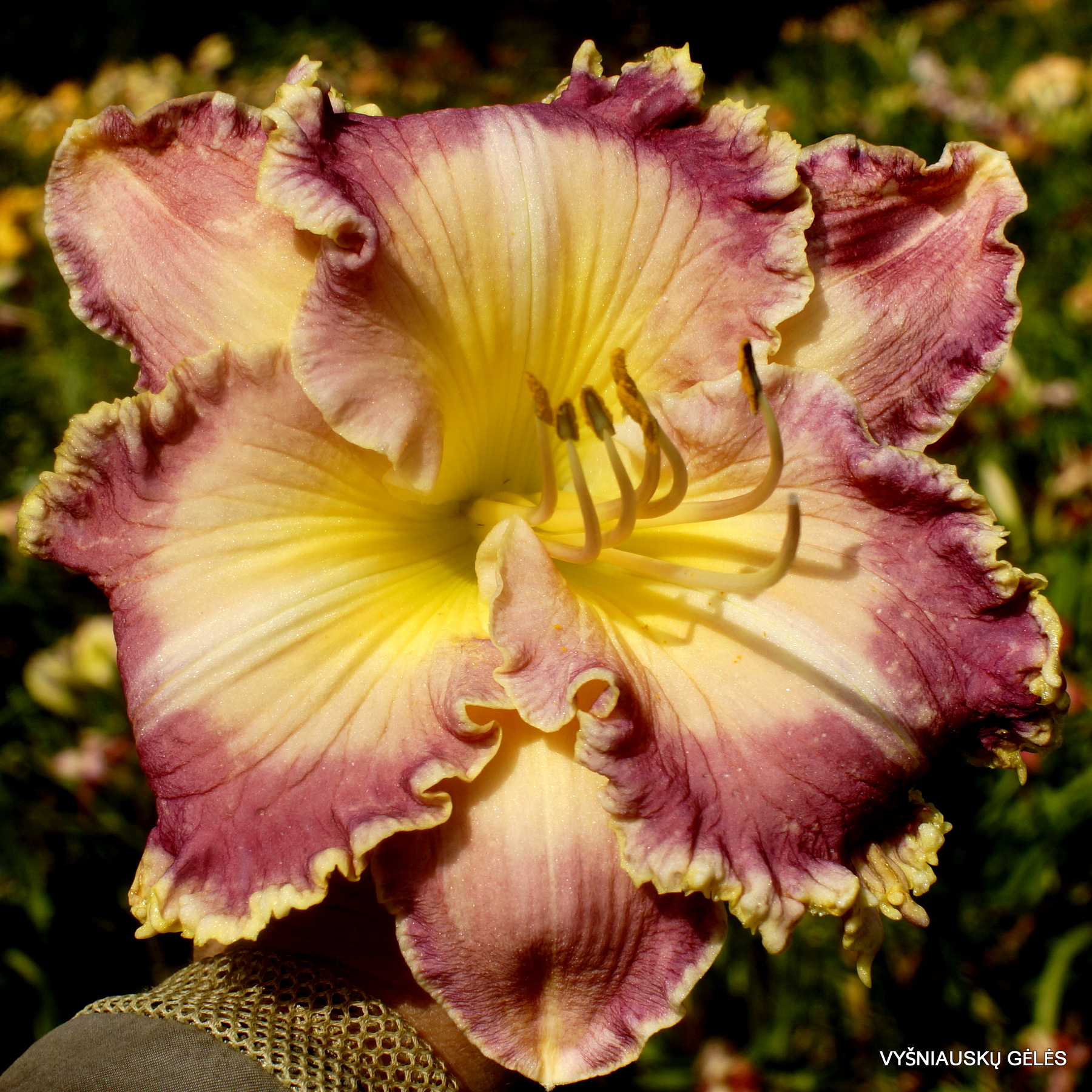 Žiedai vidutinio dydžio (14 cm skersmens) alyviškai rožiniai su labai dideliu vandenženkliu ir kreminiu garbanotu apvadu.