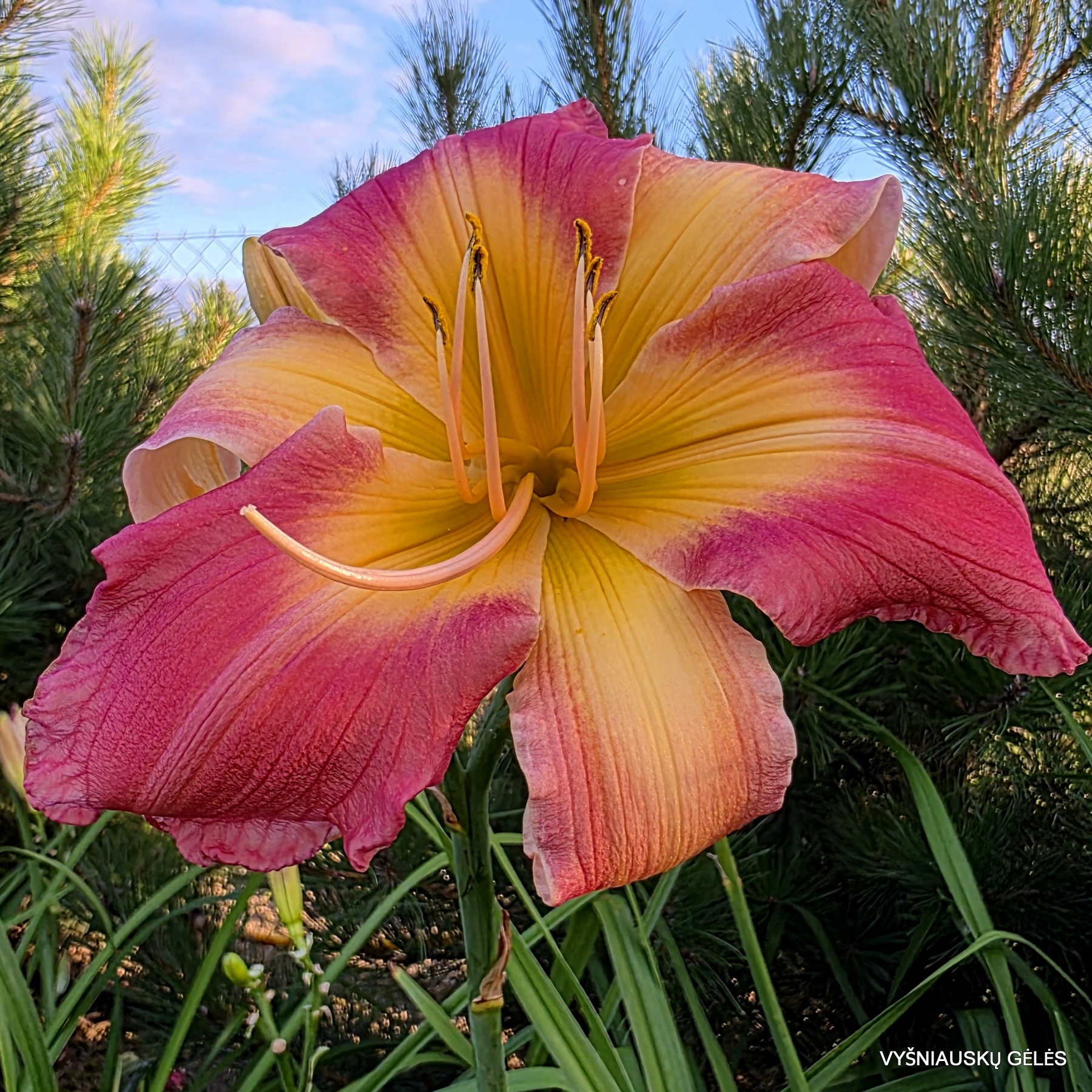 Žiedai dideli, 20 cm skersmens, avietiškai rožiniai su dideliu gelsvai žaliu centru, kuris apjuostas ryškesne akimi. Išsiskiria savo vėlyvesniu žydėjimu, nes pradeda žydėti, kai dauguma veislių jau eina į pabaigą. Žiedynas 4 kartus šakotas su 28 pumpurais. Veislė vidutinio vėlyvumo – vėlyva. A – 105 cm