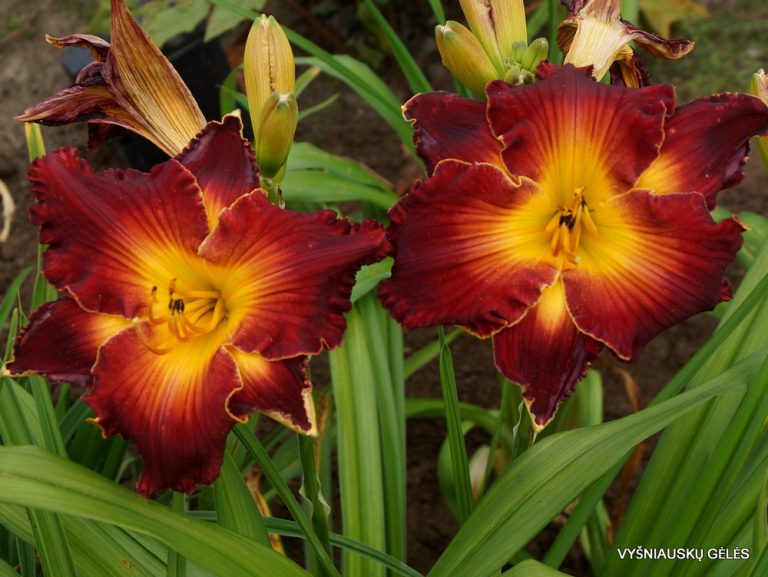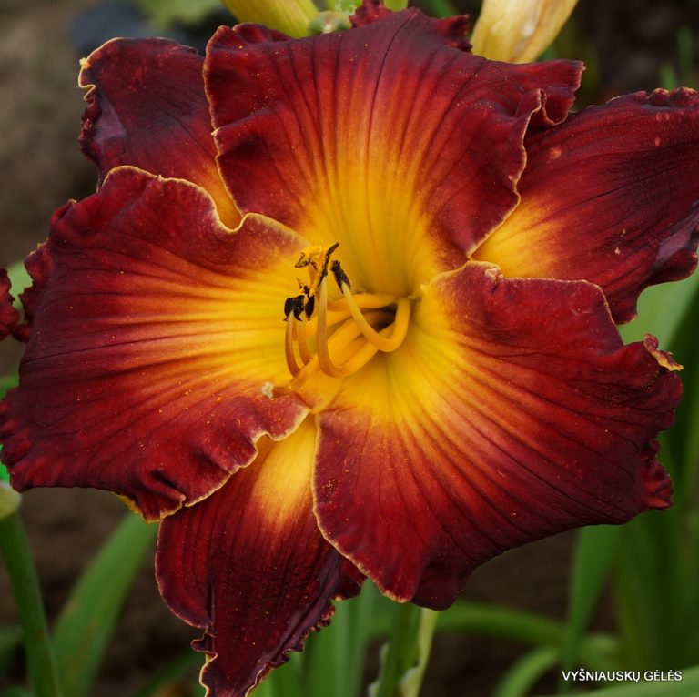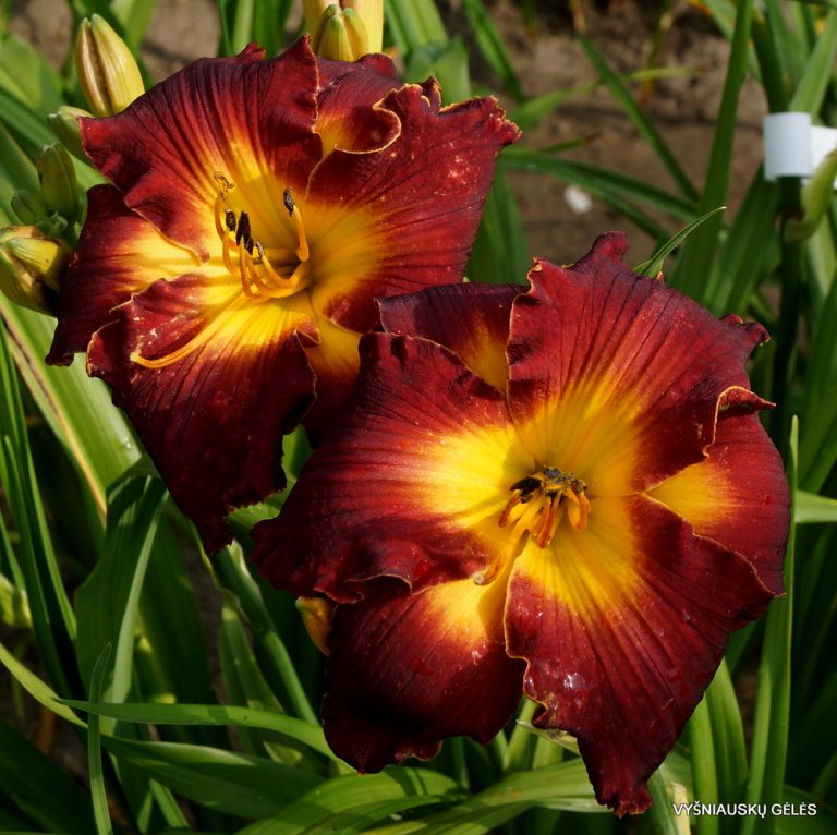 Žiedai 15 cm skersmens, tamsiai kaštoniniai su nemažu šviesesniu vandenženkliu, geltonu trikampiu centru ir ryškiomis gyslomis, kurios labai puošia žiedą. Vainiklapių ir taurėlapių pakraščiai banguoti, apvedžioti balta juostele. Labai išsiskirianti ir labai graži spalva.