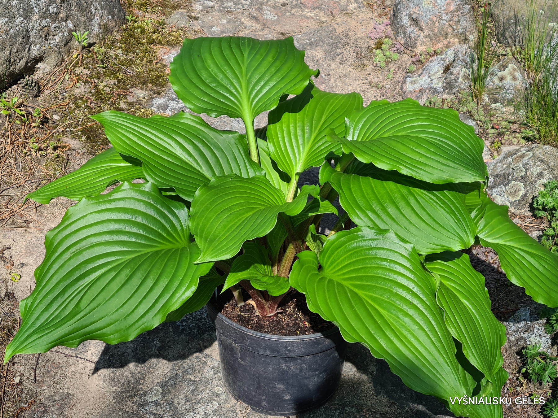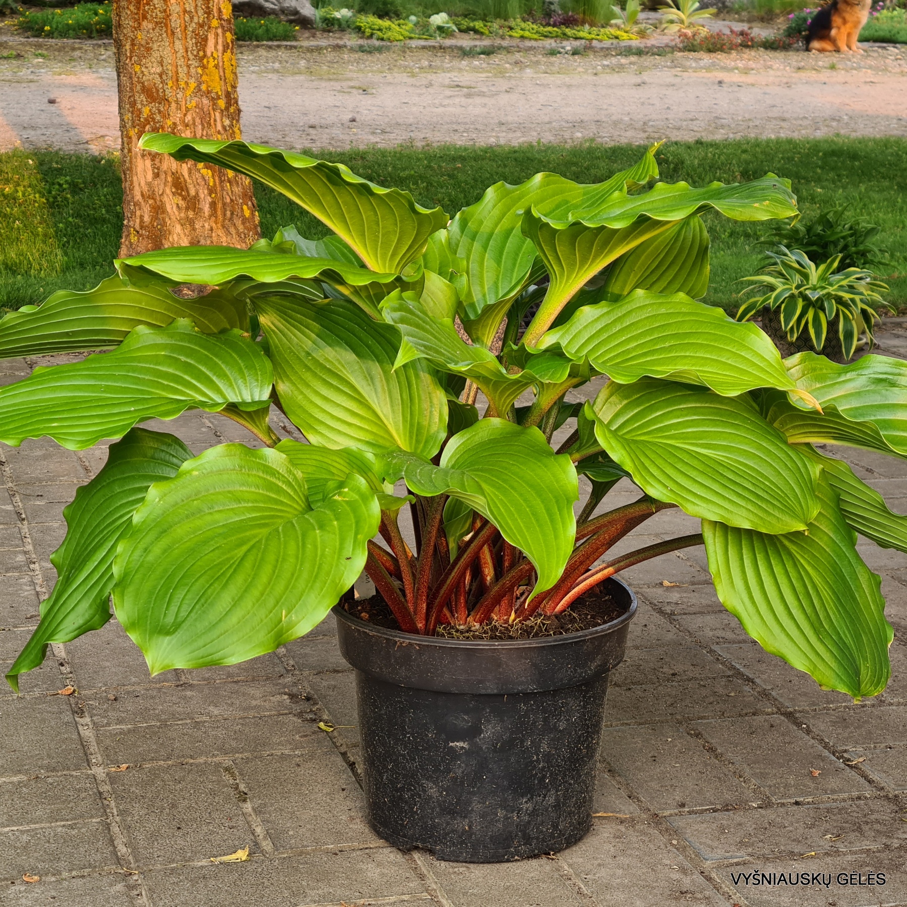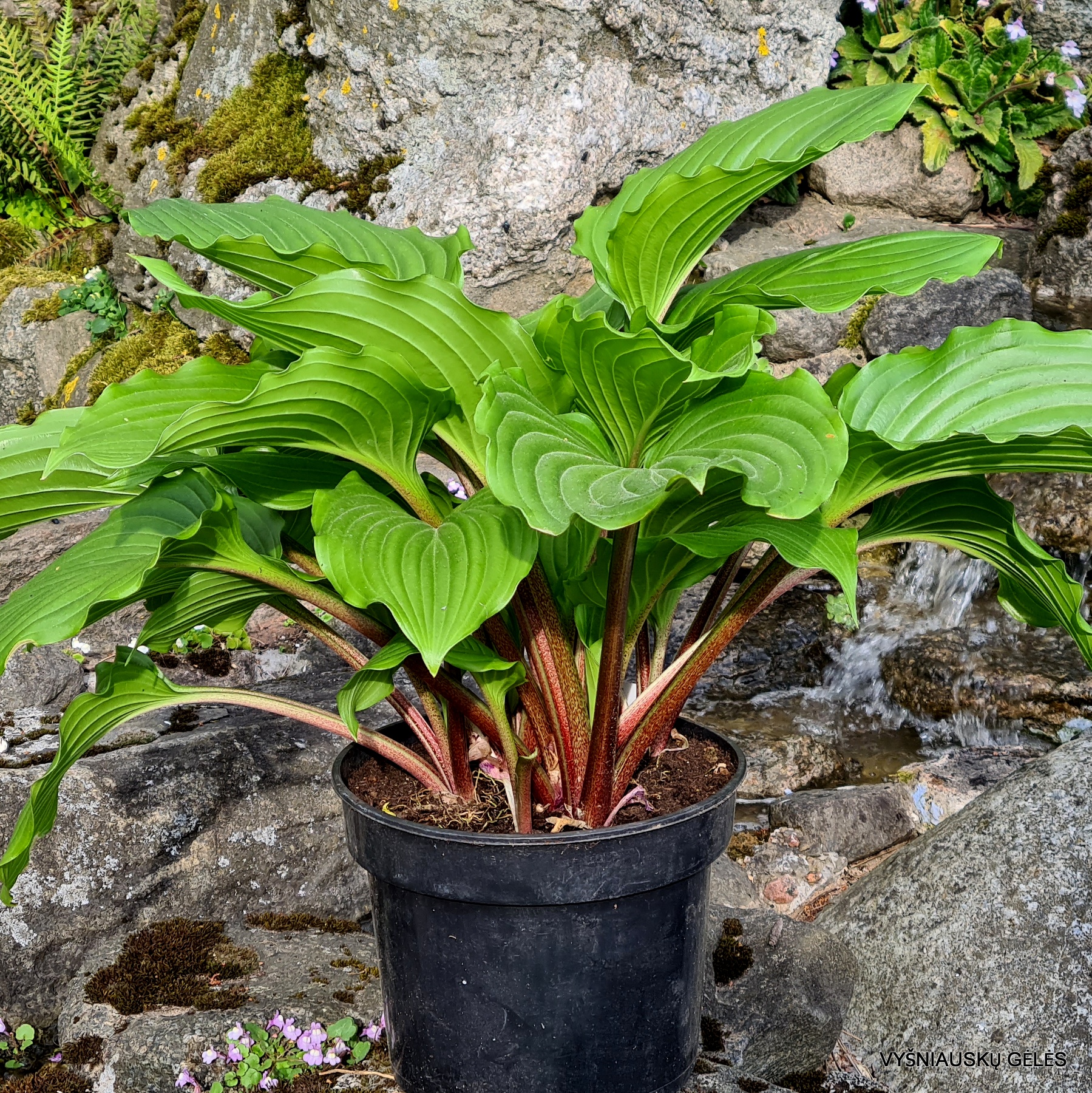blizgantys banguotais kraštais stambūs apvalūs lapai ir raudoni lapkočiai. Labai graži. Aukštis 40 – 50 cm