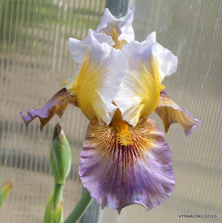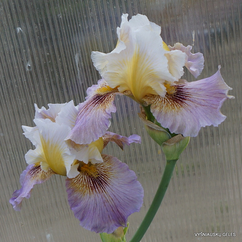 Viršutiniai vainiklapiai melsvai balti su geltona dėme, apatiniai – violetiškai rožiniai. A – 60 cm