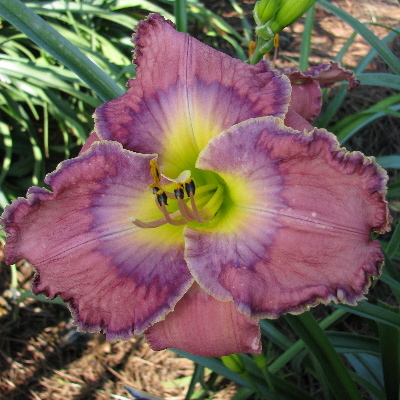 Žiedai vidutinio dydžio (15 cm skersmens), levandiški su mėlyna akimi ir dvigubu, mėlynu ir baltu, apvadu. A – 85 cm