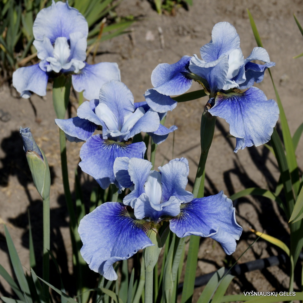 Žiedai dideli. Viršutiniai vainiklapiai šviesiai mėlyni, apatiniai mėlyni su šviesesniais vainiklapių pakraščiais. A – 70 cm