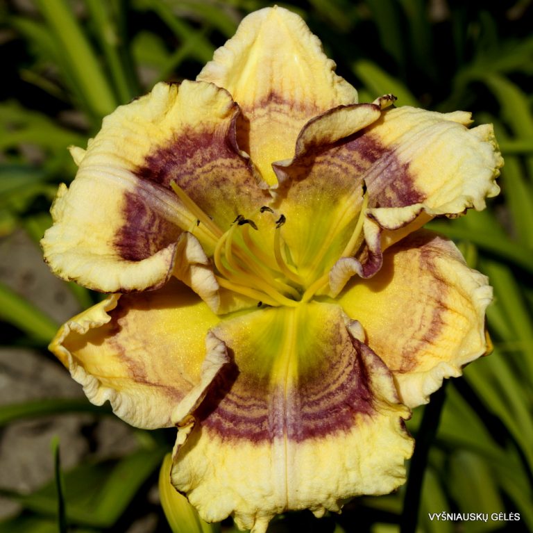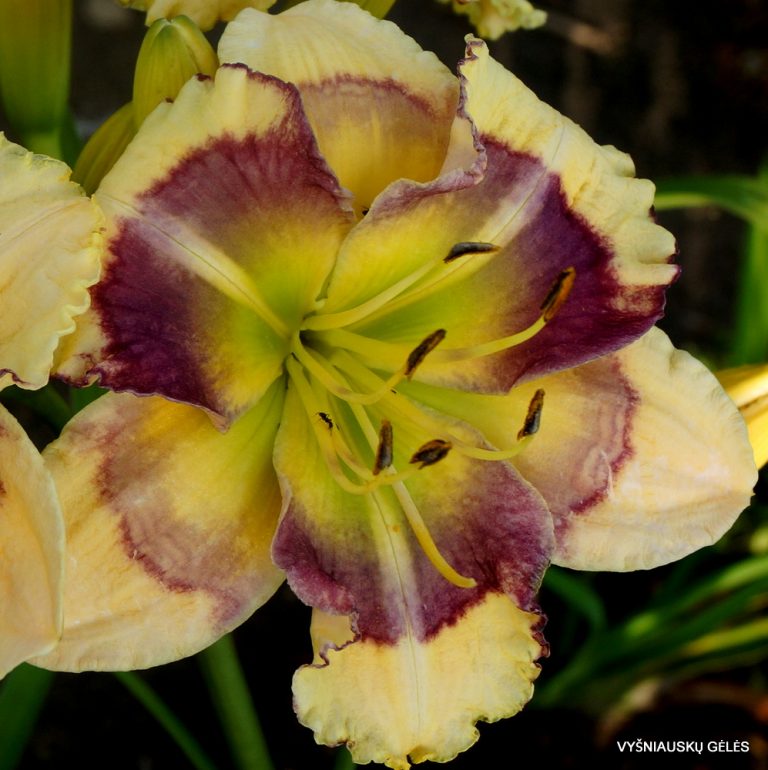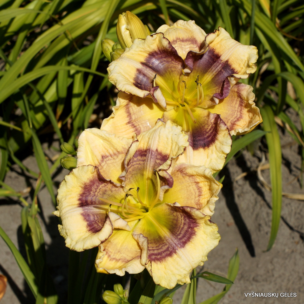 Žiedai vidutinio dydžio (14 cm) šviesiai kreminiai su dideliu mėlynu ir violetiškai purpuriniu centru. A – 80 cm