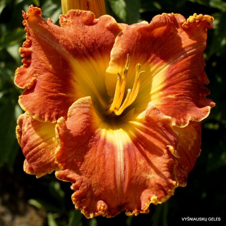 Žiedai vidutinio dydžio (14 cm skersmens) oranžiniai su garbanotais pakraščiais. A – 120 cm