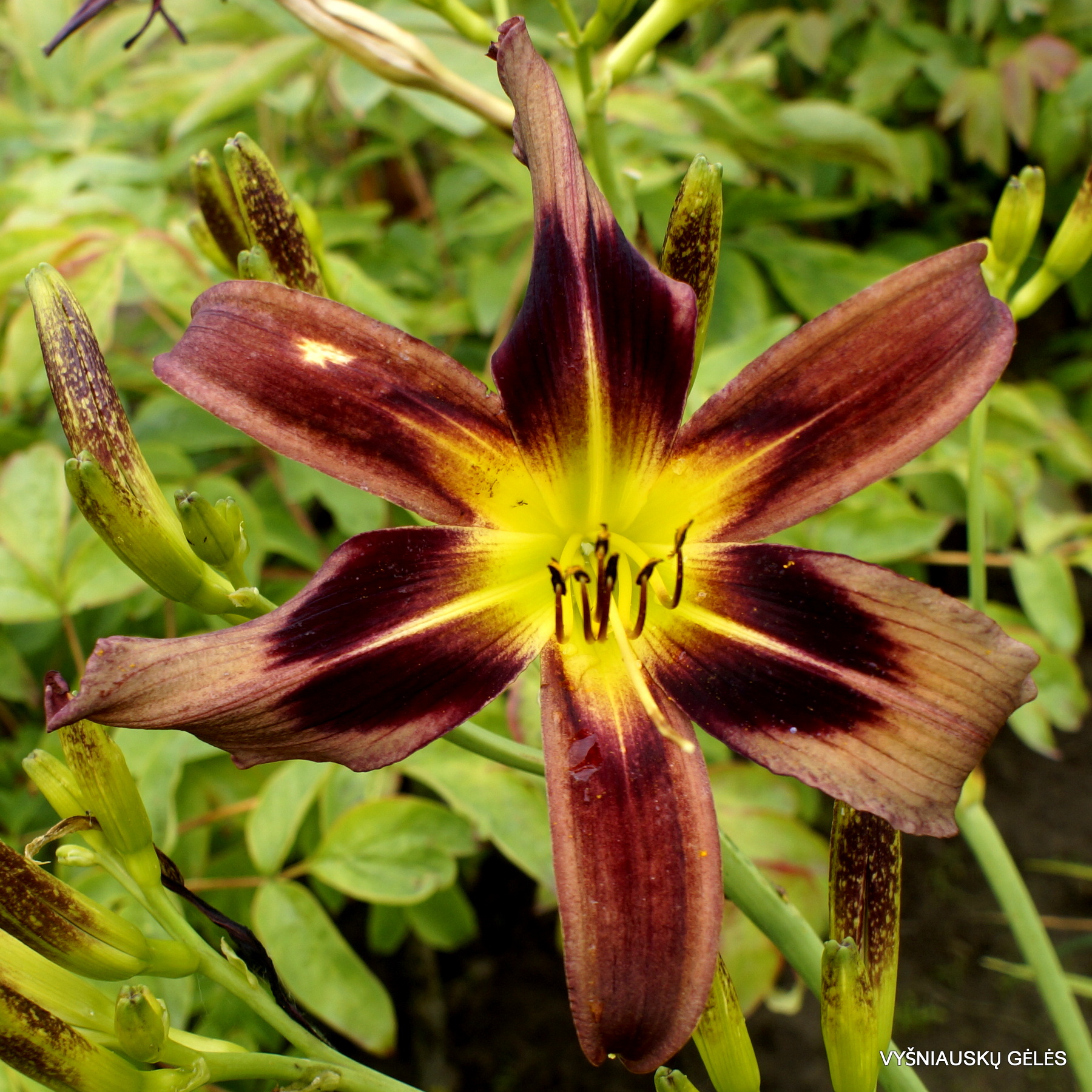 Žiedai vidutinio dydžio (13 cm skersmens) rudi su tamsiai purpurine akimi. A – 130 cm