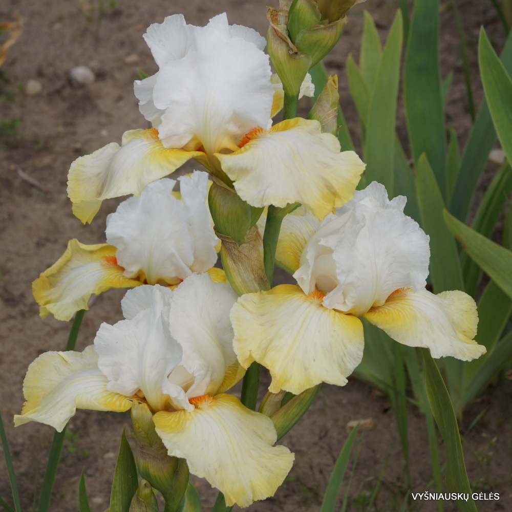 Viršutiniai vainiklapiai balti, apatiniai gelsvi su labai ryškia oranžine barzdele.