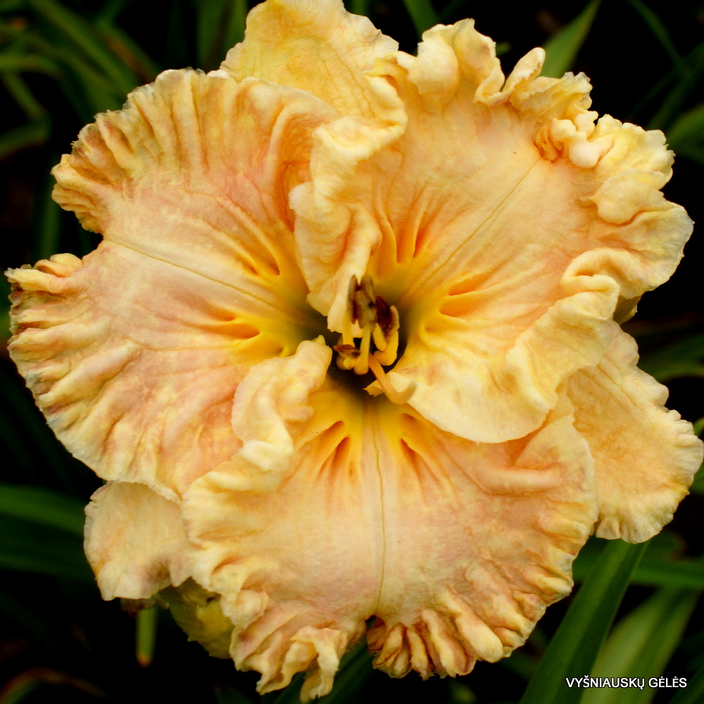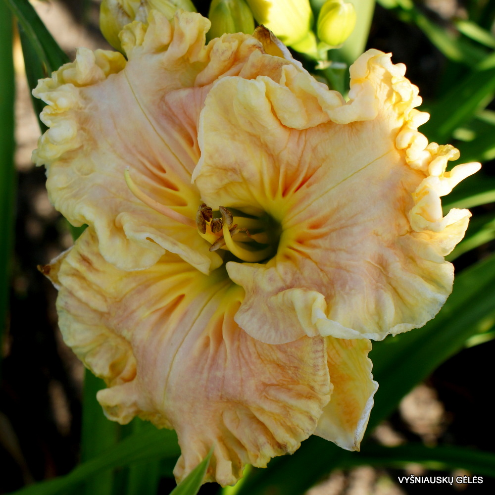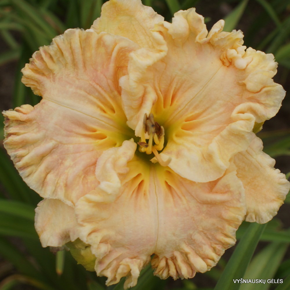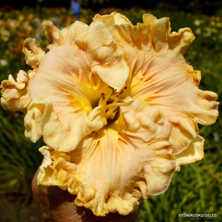 Žiedai nemaži (15 cm) kremiškai rožiniai su plačiu, garbanotu, gelsvu apvadu. A – 80 cm