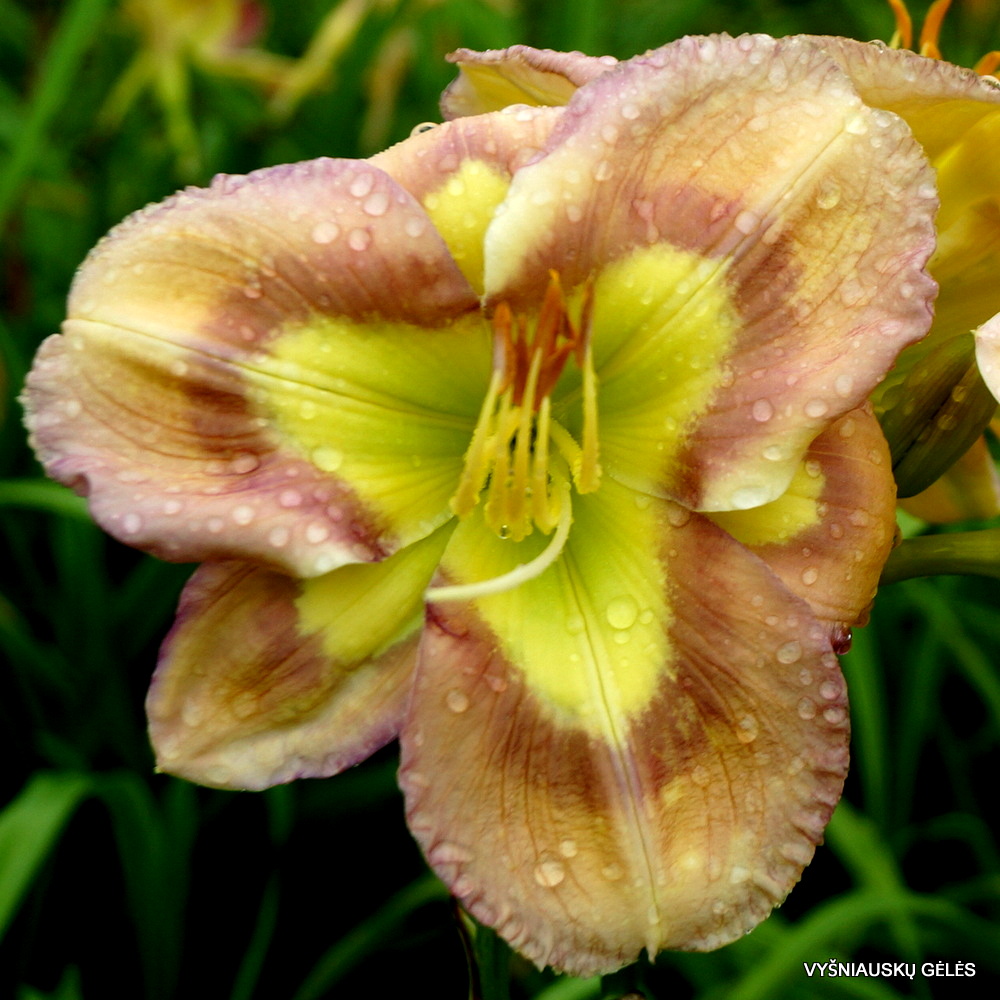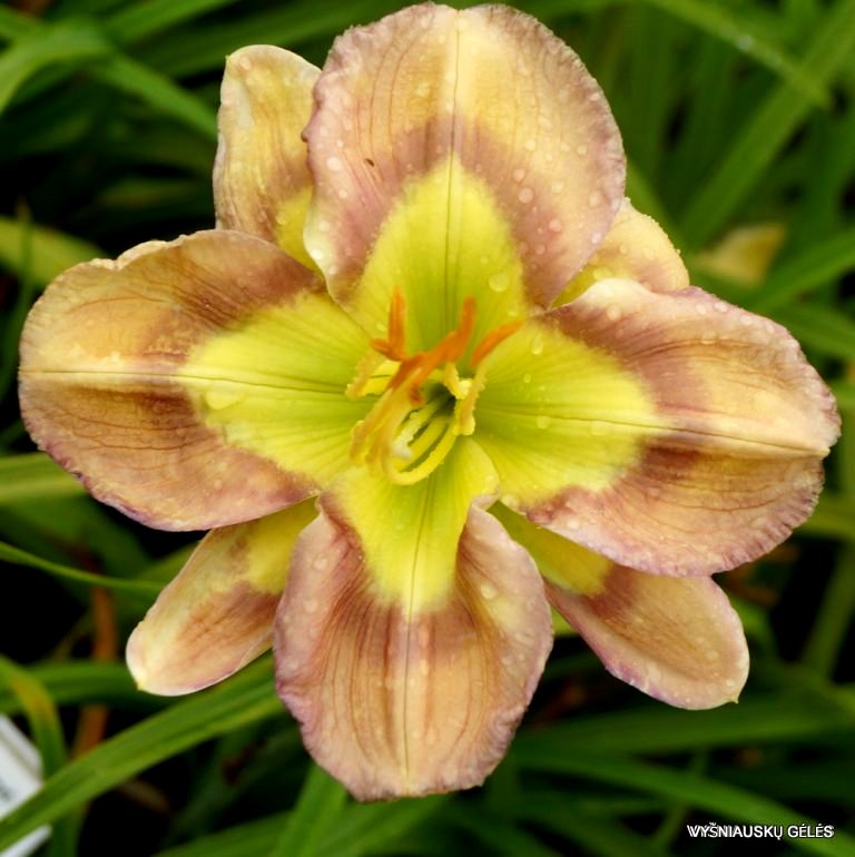 Žiedai vidutinio dydžio (12 cm skersmens), kremiškai žalsvi su labai unikalia ryškiai žalia akies zona. A – 65 cm