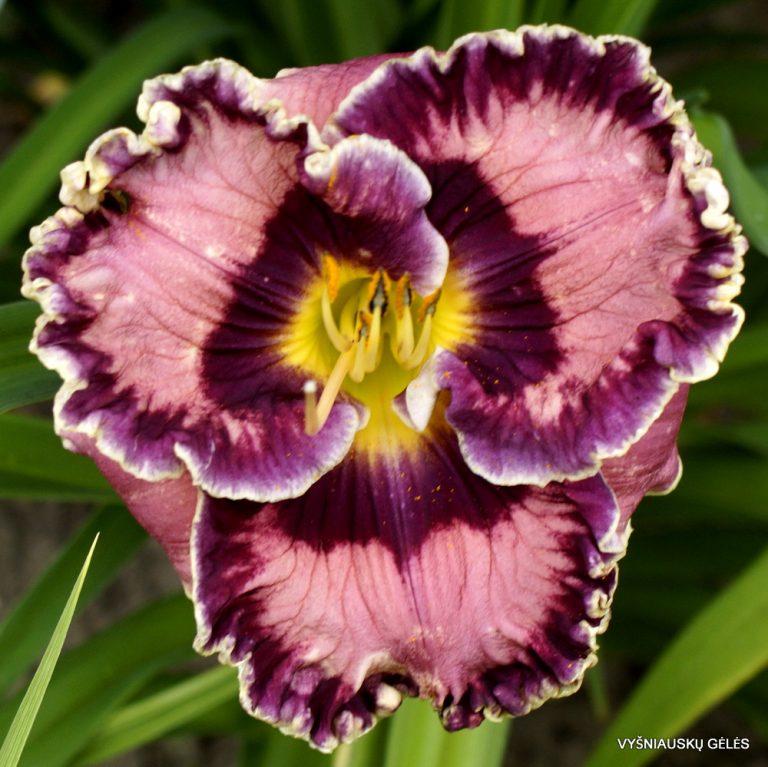 Žiedai vidutinio dydžio (16 cm skersmens) šviesiai purpuriniai su mėlynaa purpurine akimi ir apvadu. A – 65 cm