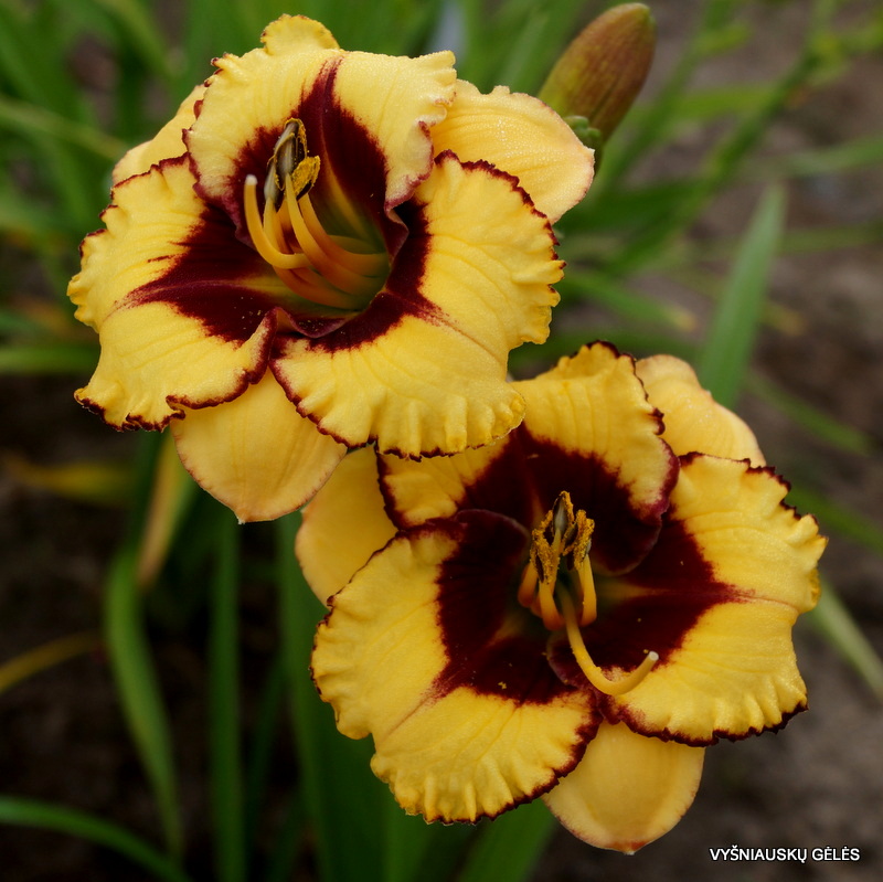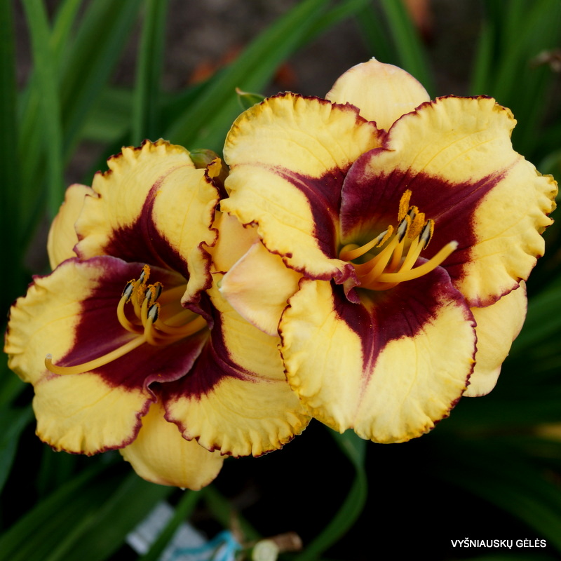 Žiedai labai smulkūs (7,5 cm skersmens), geltoni su tamsiai bordine akimi ir siauru apvadu. Žema. A – 40 cm