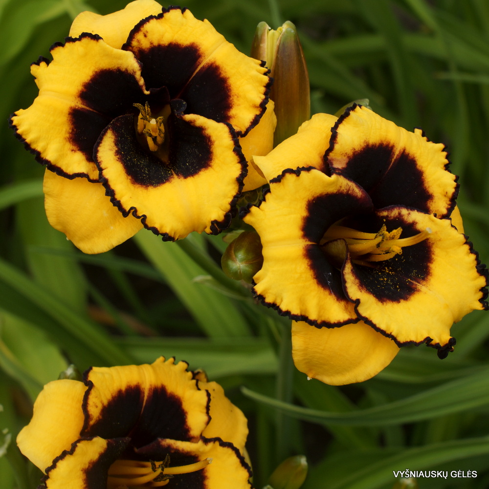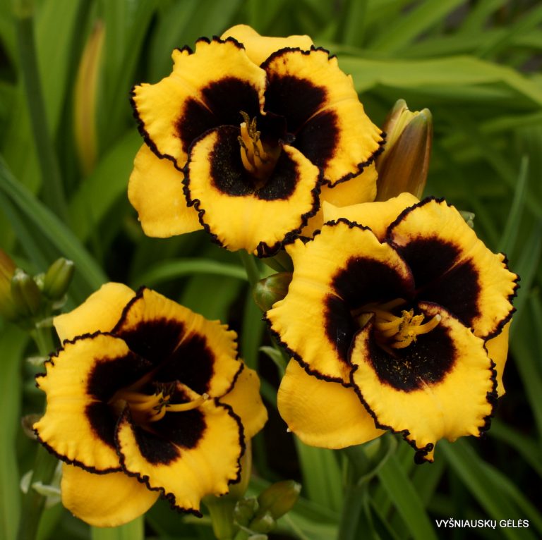 Žiedai maži (7 cm skersmens) ryškiai geltoni su juoda akimi ir apvadu. A – 60 cm