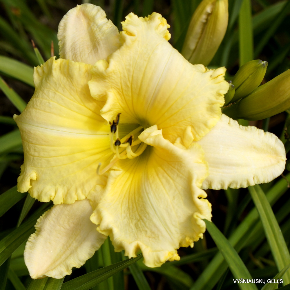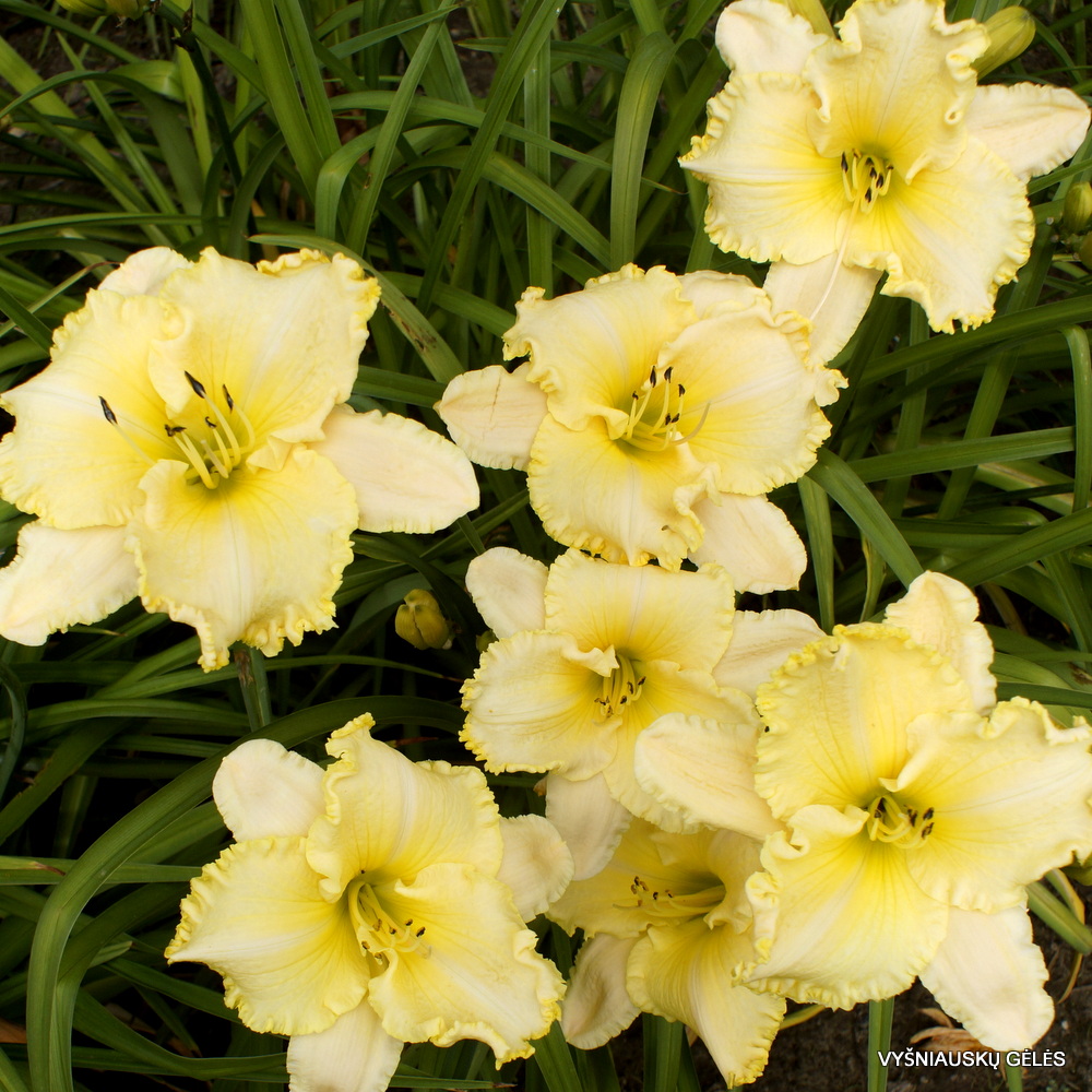 Žiedai vidutinio dydžio (14 cm skersmens), šviesiai gelsvai kreminiai, artimi baltiems su garbanotu, geltonu apvadu. A – 70 cm
