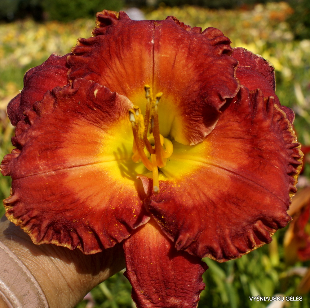 Žiedai vidutinio dydžio (13 cm skersmens) raudoni su rožiniu vandenženkliu. A – 65 cm