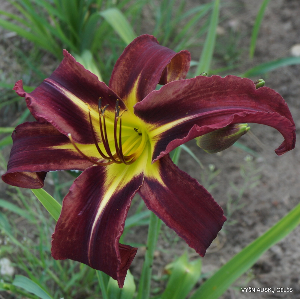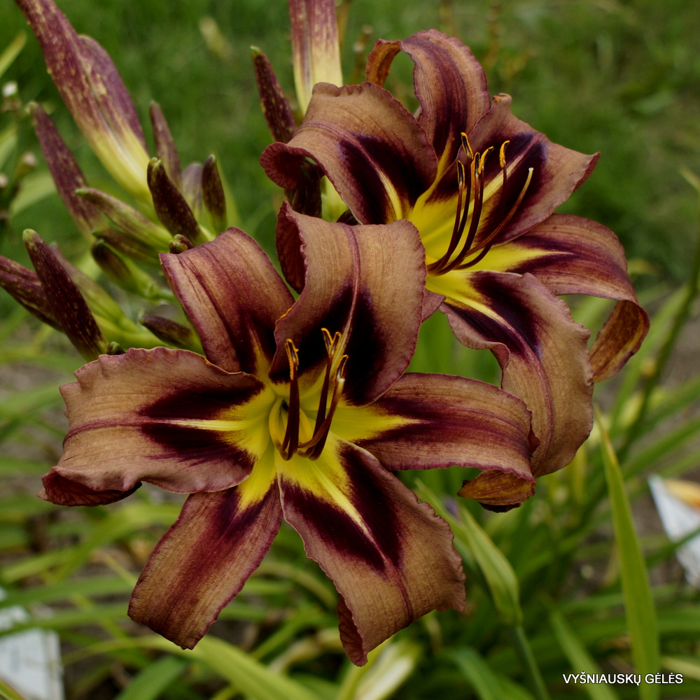 Žiedai nemaži (18 cm skersmens) tamsiai purpuriniai. A – 115 cm