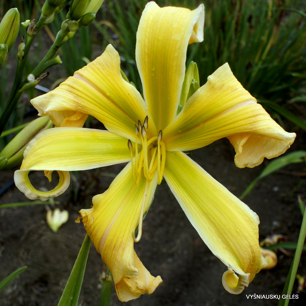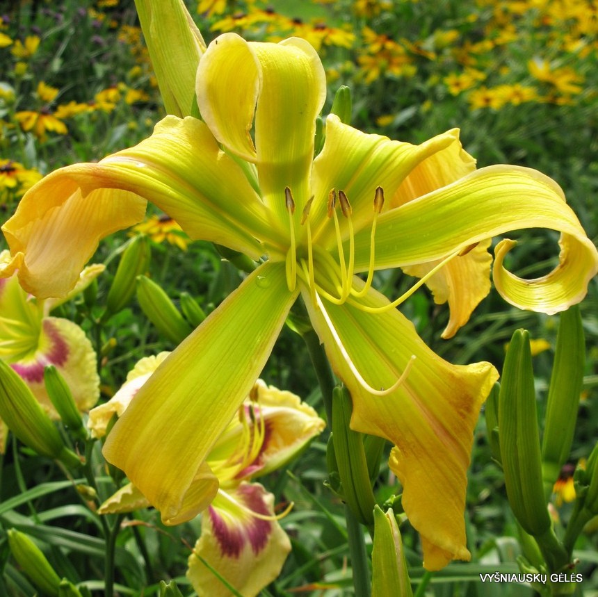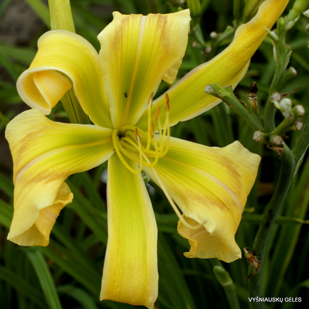 Žiedai labai dideli (24 cm skersmens) švelniai oranžiniai su didžiuliu gelsvai žaliu centru. A – 100 cm