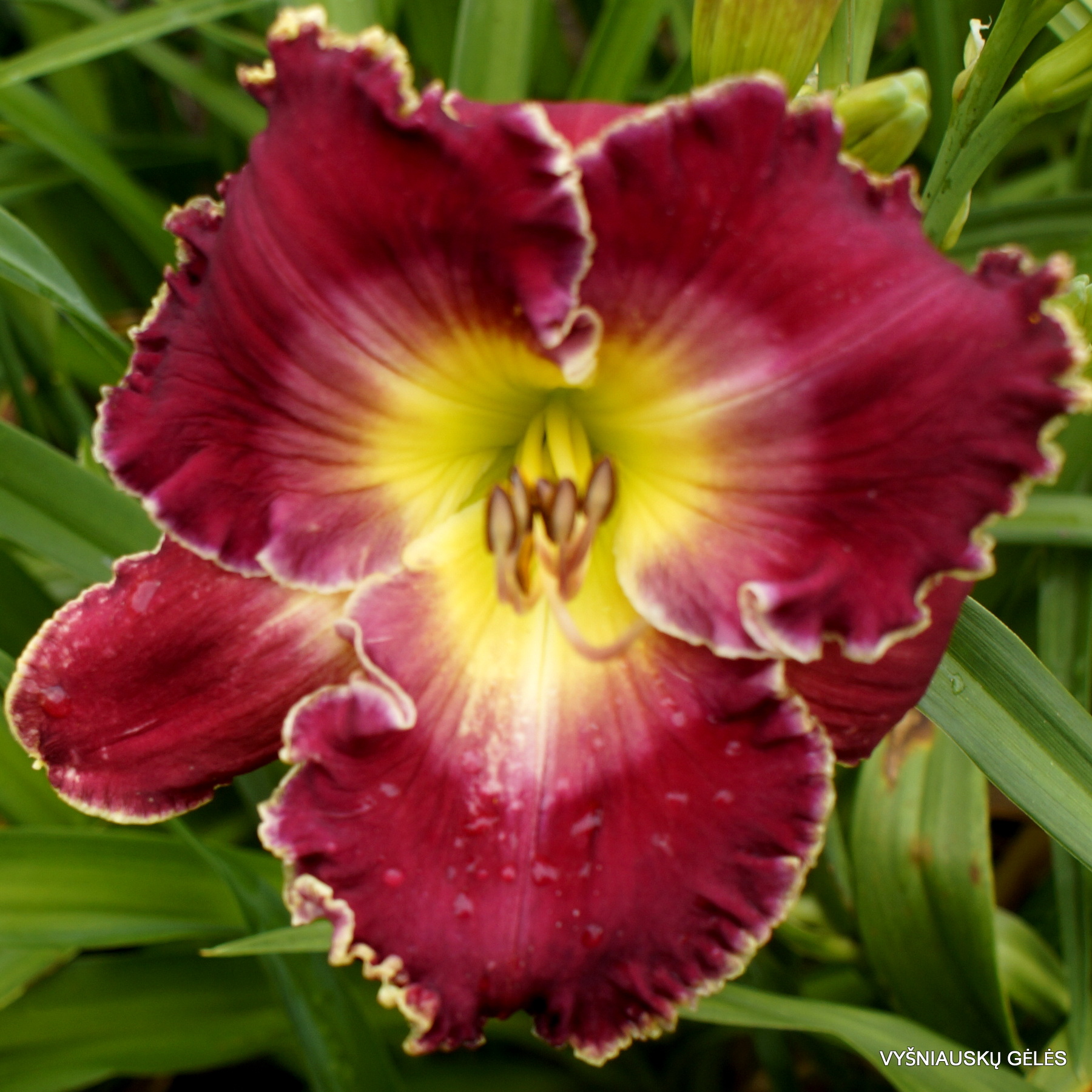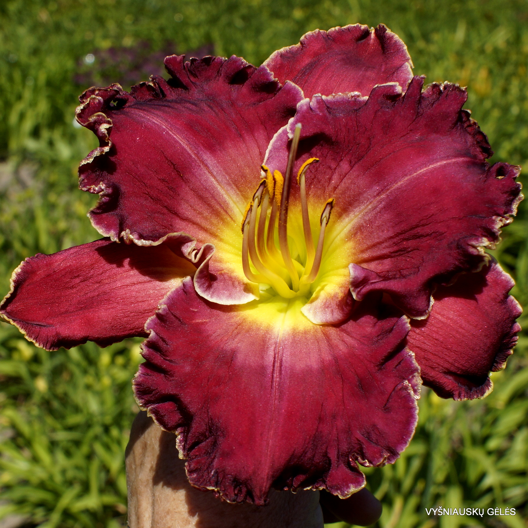 Žiedai nemaži (18 cm skersmens) rožiškai raudoni su gelsvu apvadu. A – 70 cm