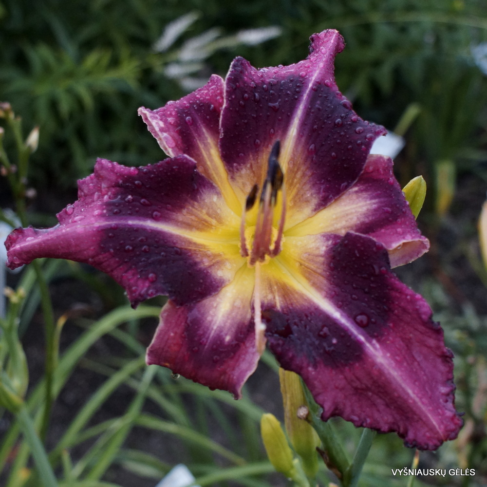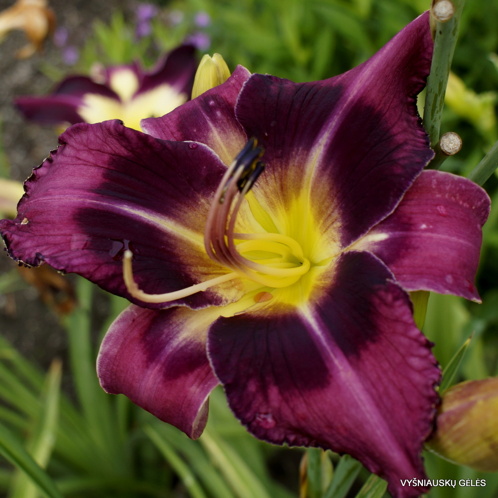 Žiedai dideli (20 cm skersmens) purpuriniai su tamsiai purpurine akimi ir apvadu. A – 90 cm