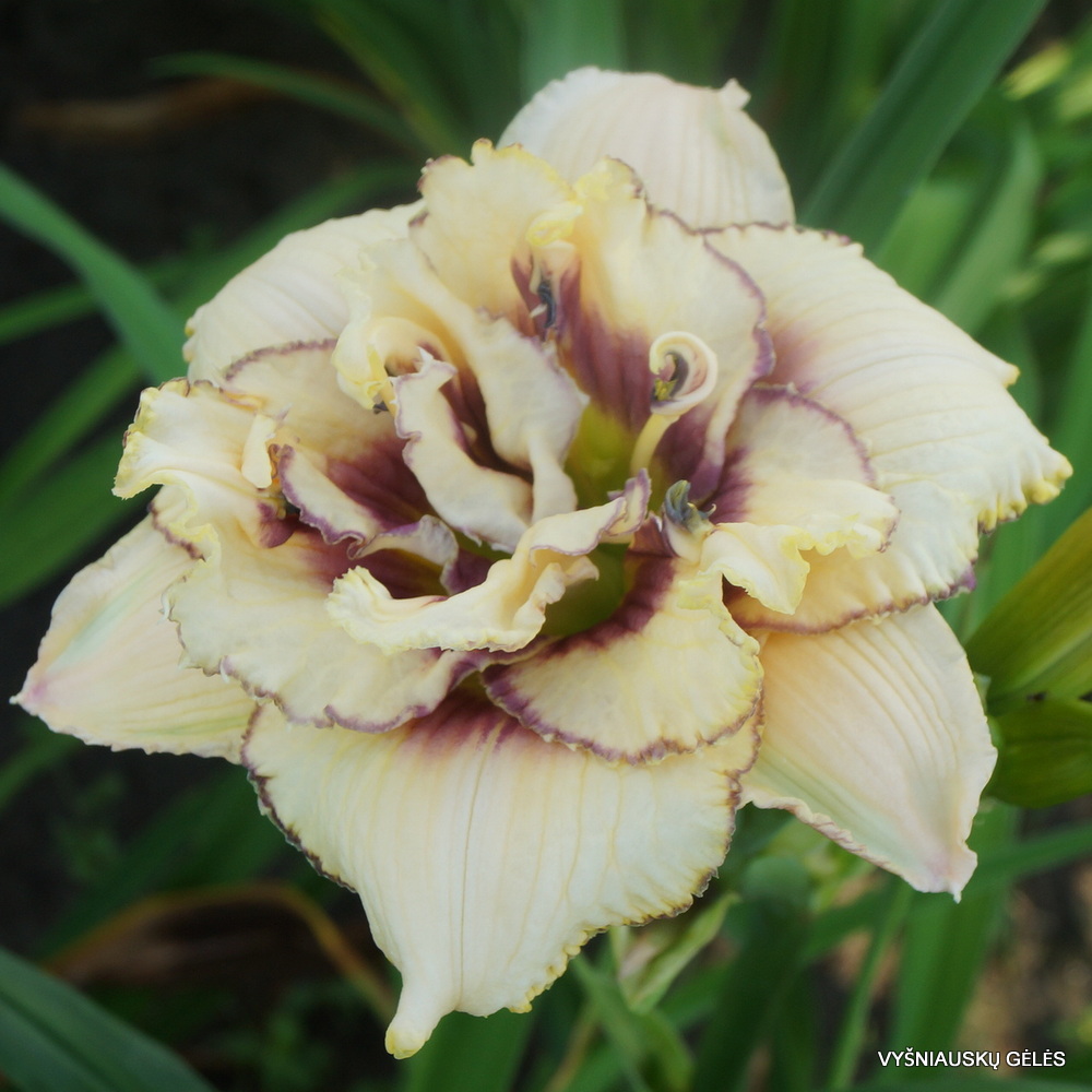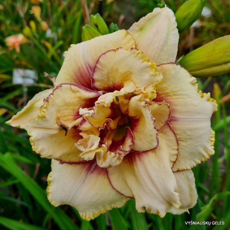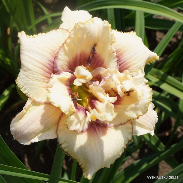 Žiedai pilnaviduriai vidutinio dydžio (14 cm skersmens) kreminiai su purpuriniu centru. A – 85 cm