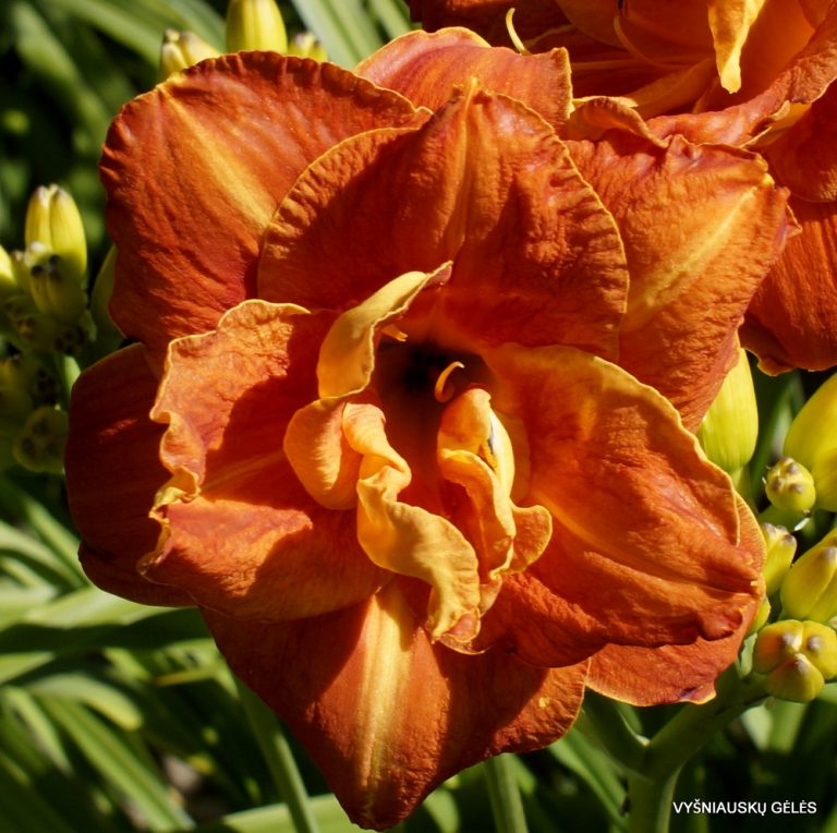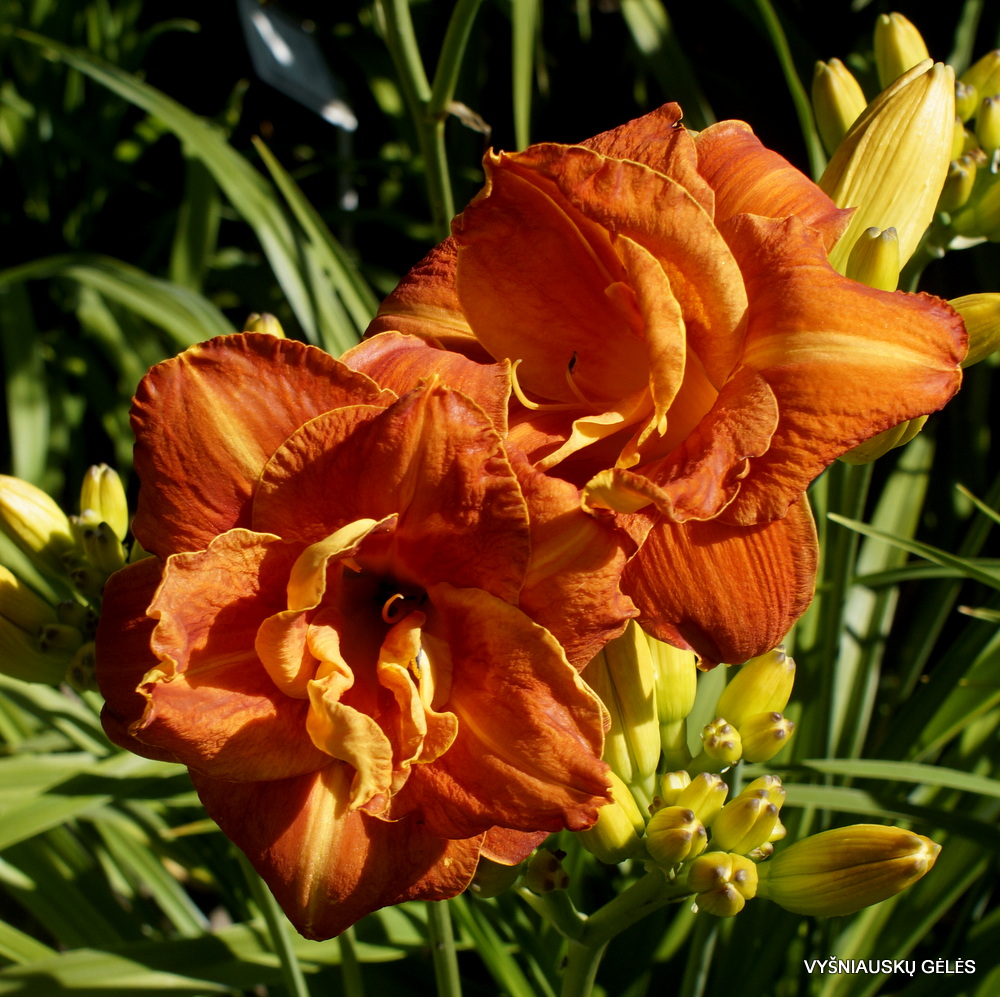 Žiedai vidutinio dydžio (13 cm skersmens) pilnaviduriai, oranžinės ir geltonos spalvos mišinys. A – 65 cm