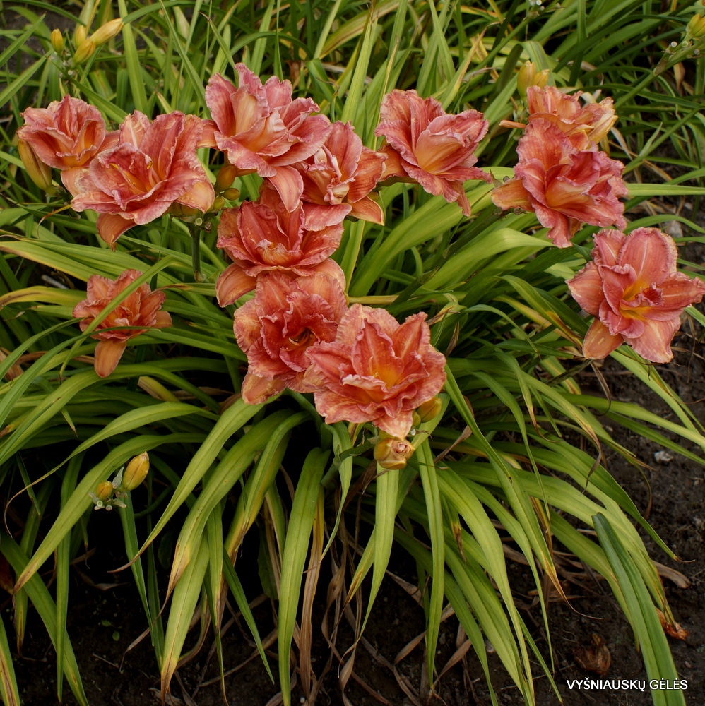 Žiedai pilnaviduriai, vidutinio dydžio (12,5 cm skersmens), koralinės spalvos. A – 55 cm