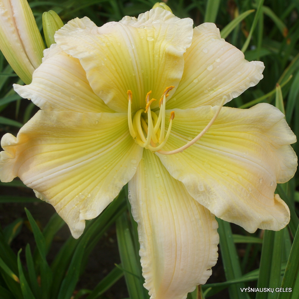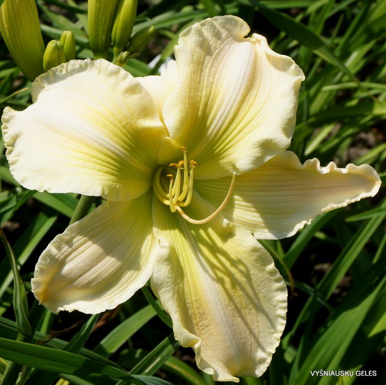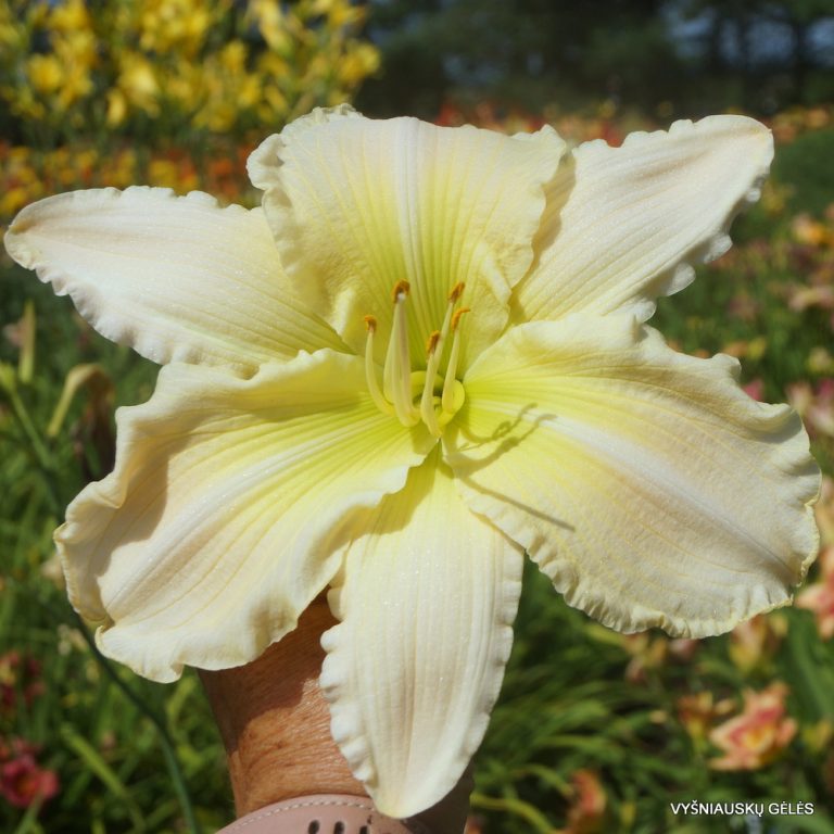 Žiedai dideli (18 cm skersmens) beveik balti su žaliu centru. A – 50 cm