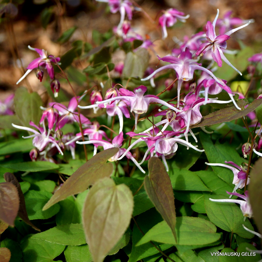 Žiedai alyviškai rožiniai su ilgais baltais pentinais. Jauni lapai purpuriniai. Žydi gegužės – birželio mėn. A – 30 cm