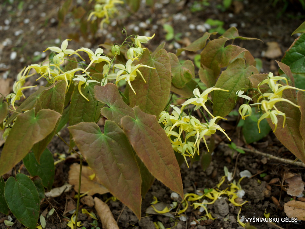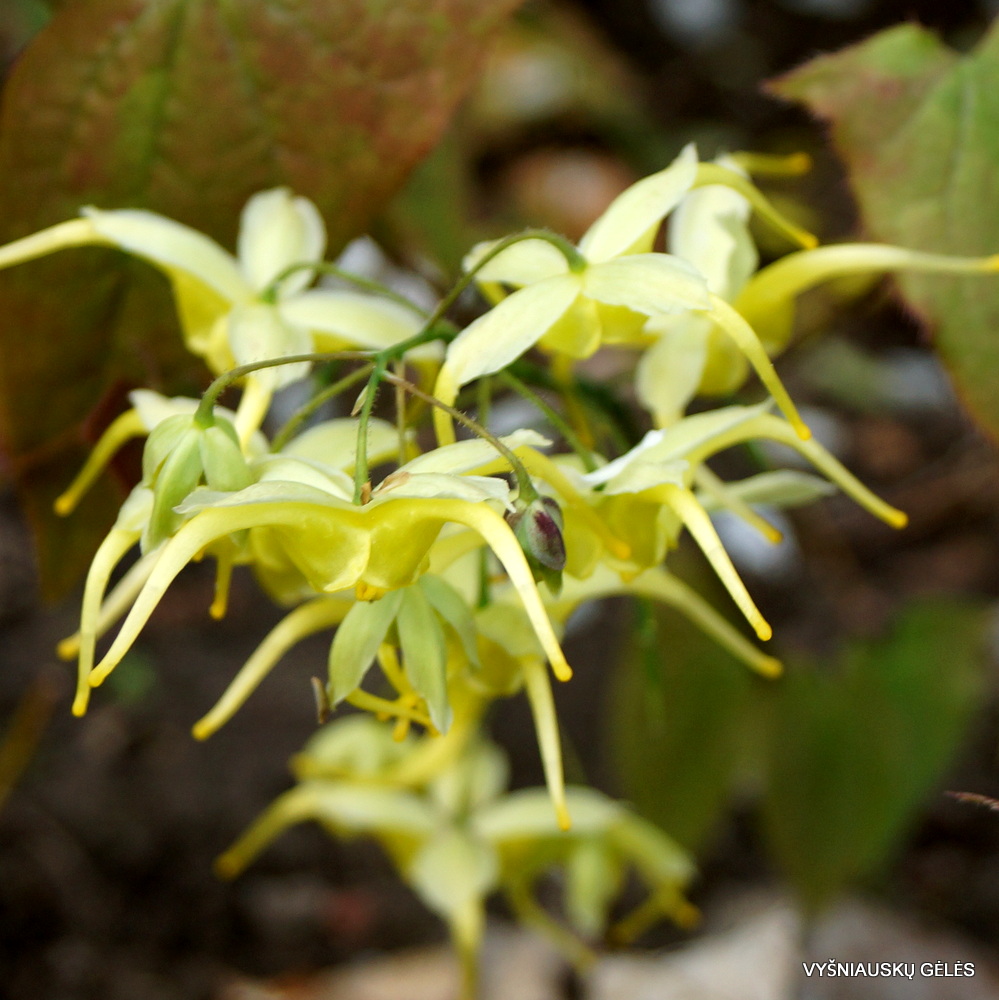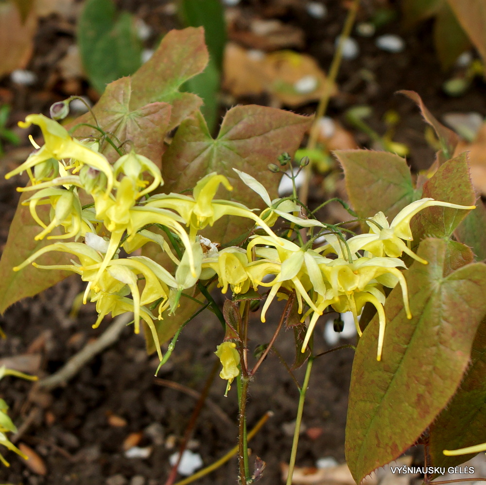 Labai puošnus epimedis stambiais citriniškai geltonais žiedais su baltu viršumi. Išskirtiniai puošnūs dideli rausvai bronziniai lapai. Žydi balandžio – gegužės mėnesį. A – 20-25 cm
