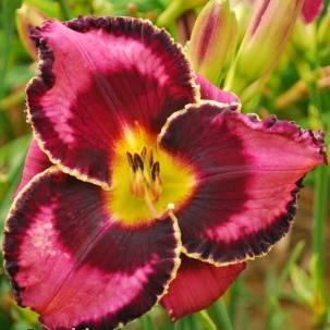 Žiedai vidutinio dydžio (14 cm skersmens), avietiškai rožiniai su labai tamsiu, juosvai raudonu centru ir apvadu. A – 70 cm