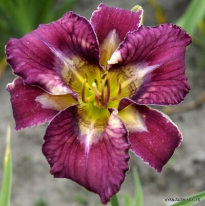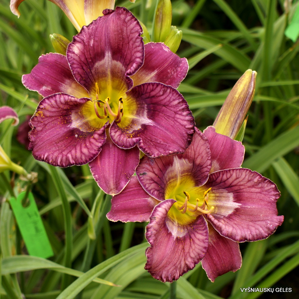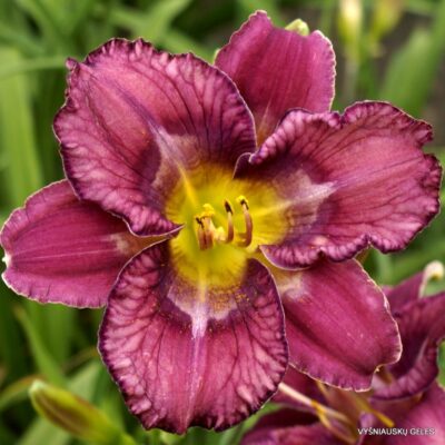 Žiedai 14 cm skersmens purpuriniai su raštuota daugiaspalve akimi ir žaliu centru. Raštai keičiasi, priklausomai nuo orų.