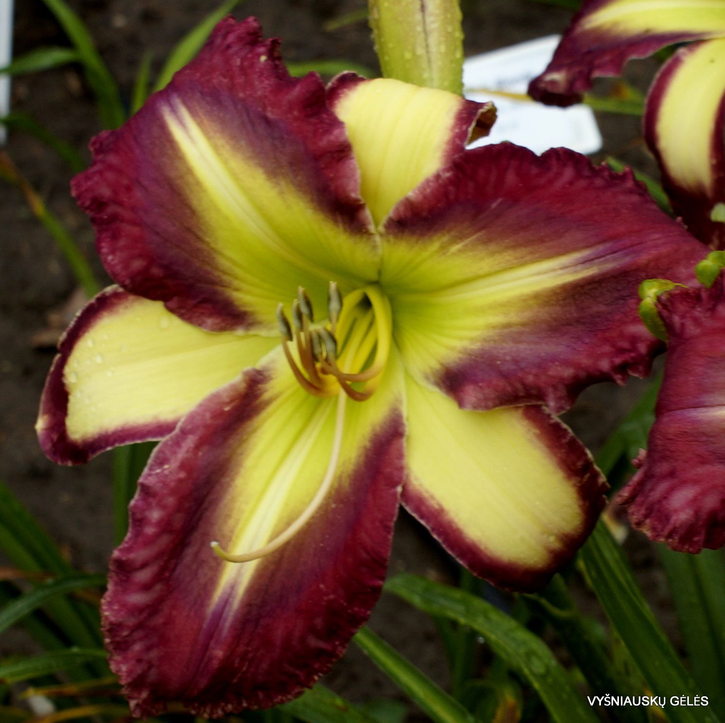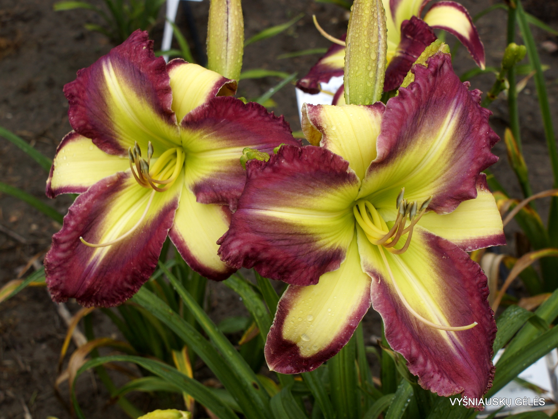 Žiedai labai dideli (29 cm skersmens) purpuriniai su labai dideliu gelsvai žaliu centru. A – 75 cm