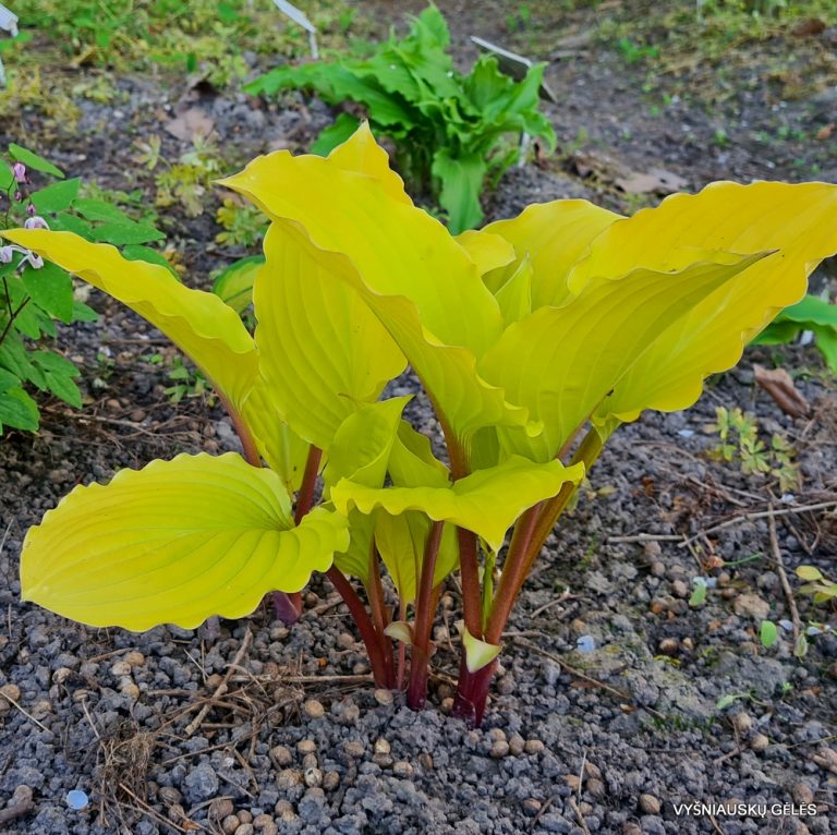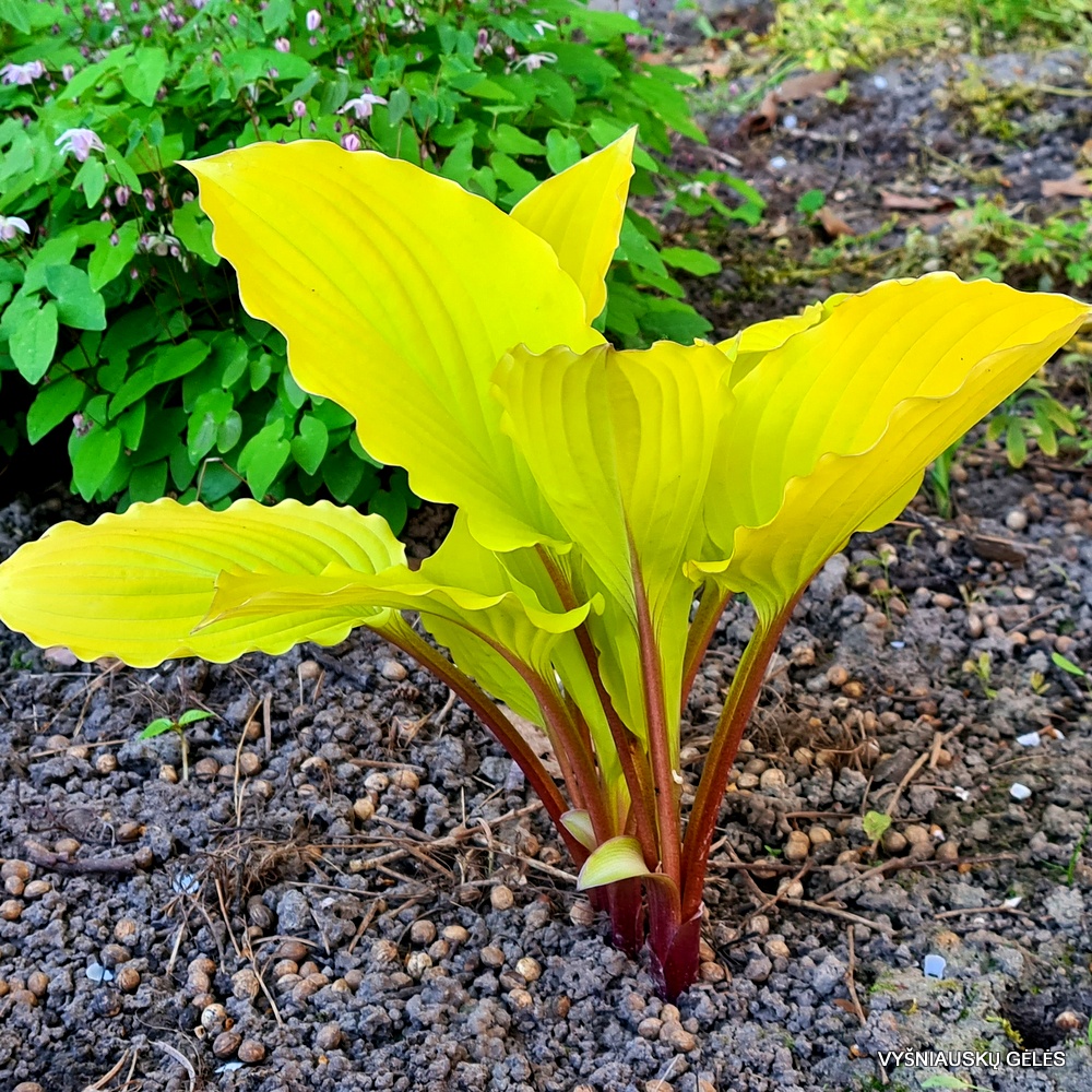 Puiki pavasarinė geltona spalva. Raudoni lapkočiai ir banguoti lapų pakraščiai. Aukštis – 35 cm