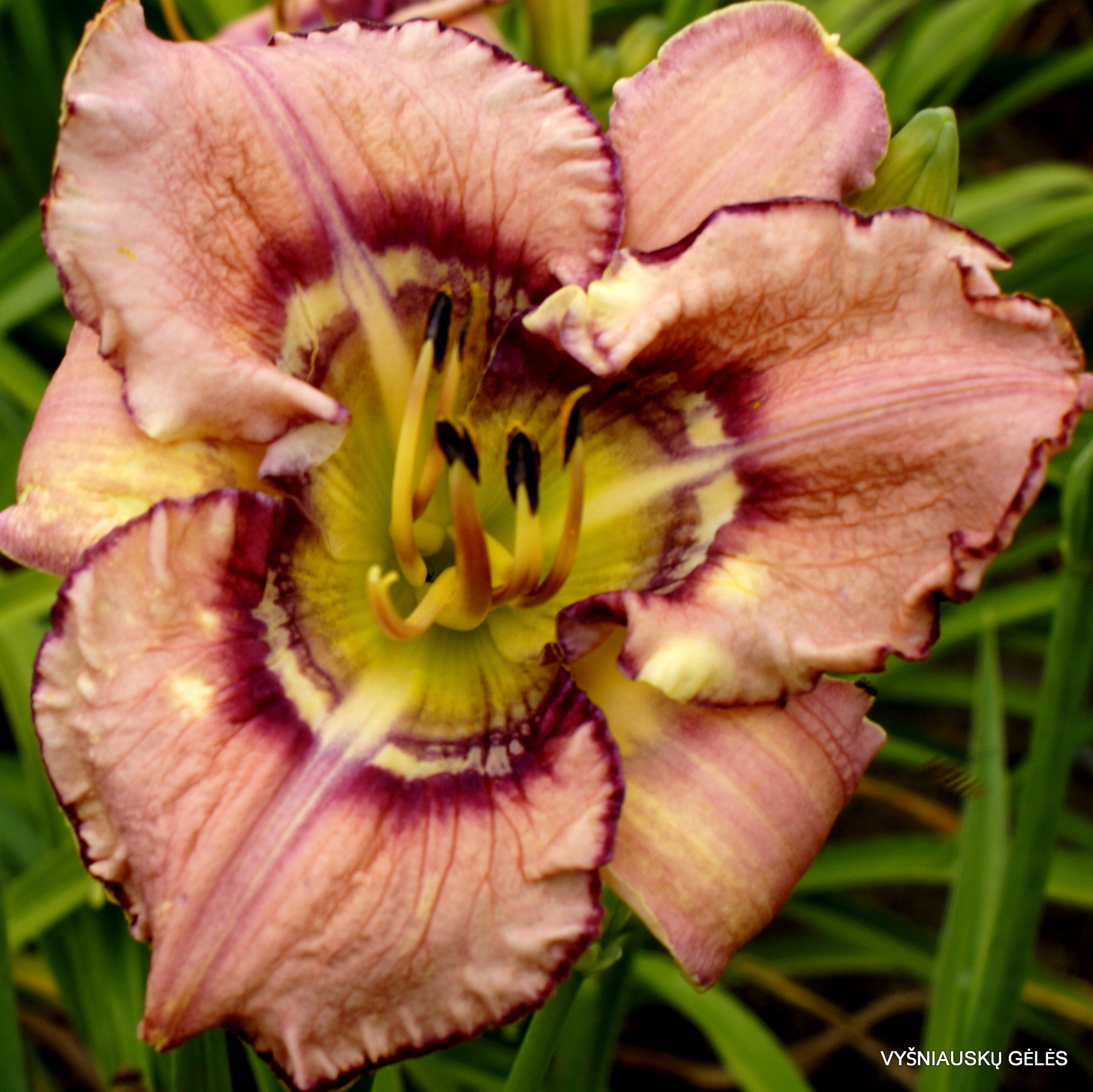 Žiedai vidutinio dydžio (15 cm skersmens) alyviškai rožiniai su purpurine dryžuota akimi. A – 80 cm