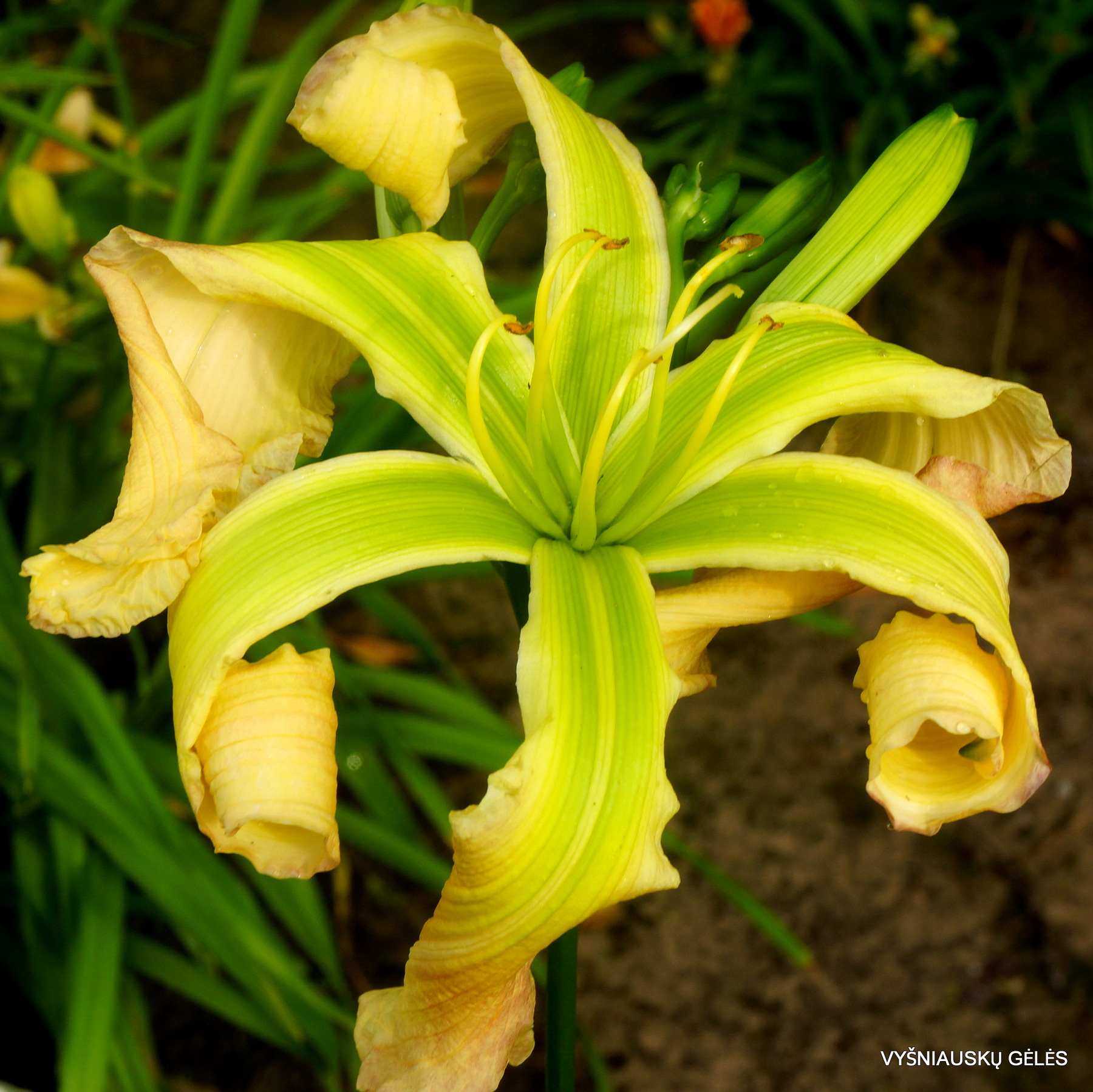 Žiedai dideli (22 cm skersmens) šviesios persikų spalvos su labai dideliu ryškiai žaliu centru.