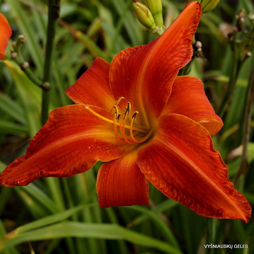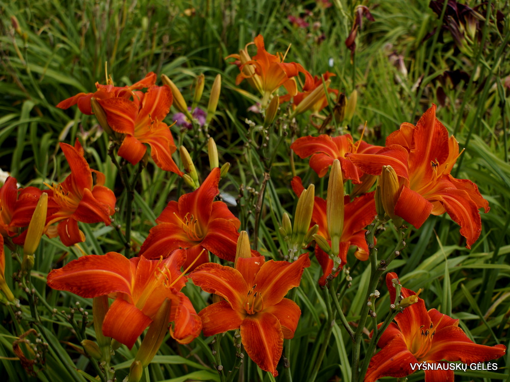 Žiedai stambūs (19 cm skersmens), labai ryškiai raudonai oranžiniai. A – 110 cm