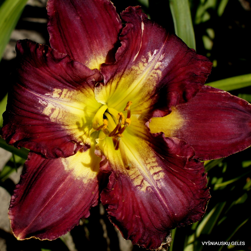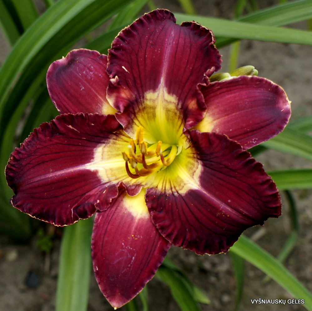Žiedai vidutinio dydžio (14 cm skersmens) purpuriškai raudoni su dryžuotu centru. A – 70 cm