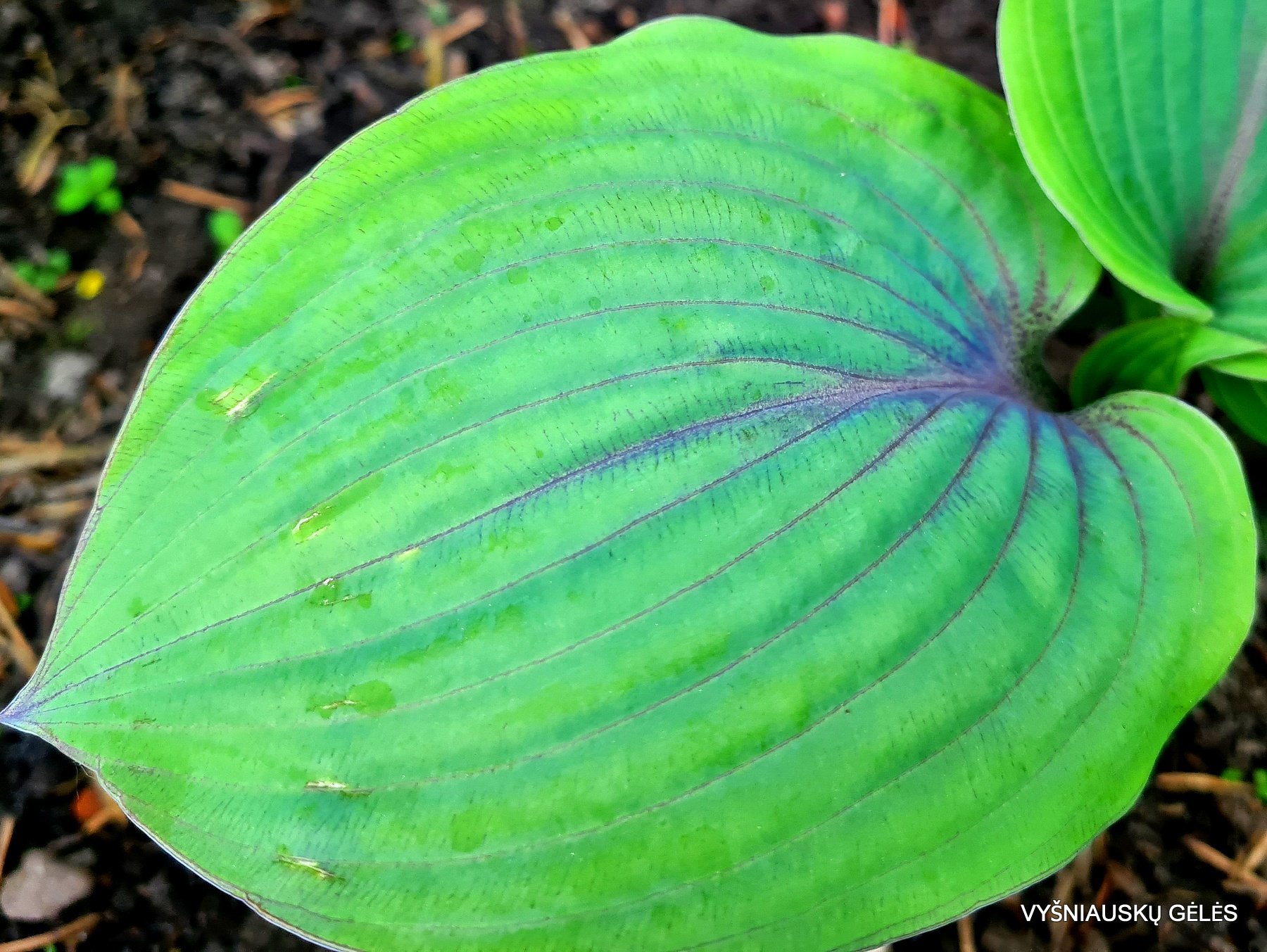 Smailūs žaliai mėlyni lapai ir rausvai violetiniai lapkočiai. Violetinė spalva tęsiasi ir į lapą. Aukštis – 40 cm