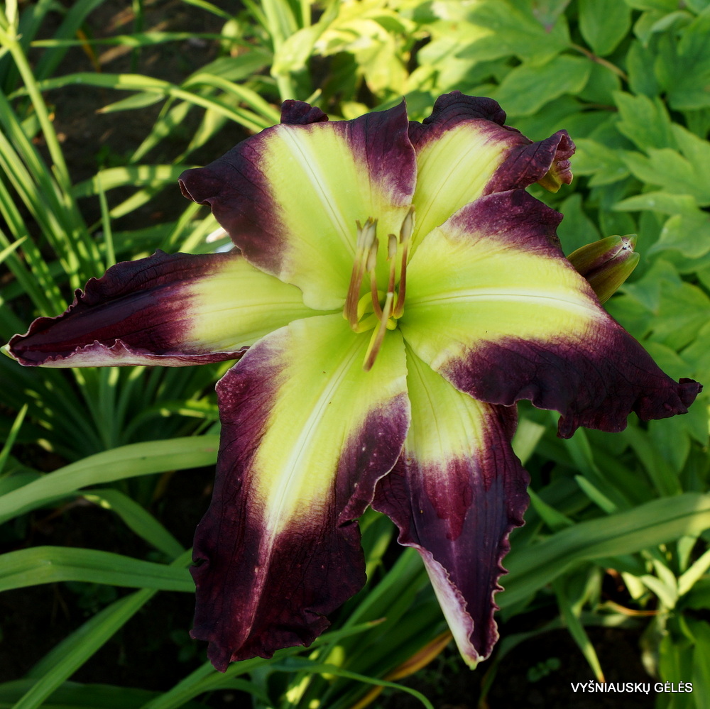 Žiedai nemaži (17 cm skersmens) tamsiai purpurinė su žaliu centru. A – 70 cm