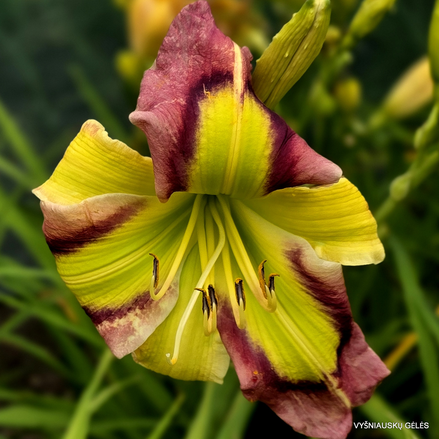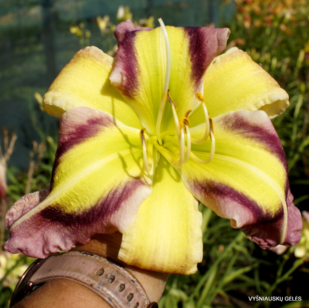 Žiedai vidutinio dydžio (16 cm skersmens) labai didelis žalsvai geltonas centras su purpuriniu apvadu. A – 80 cm