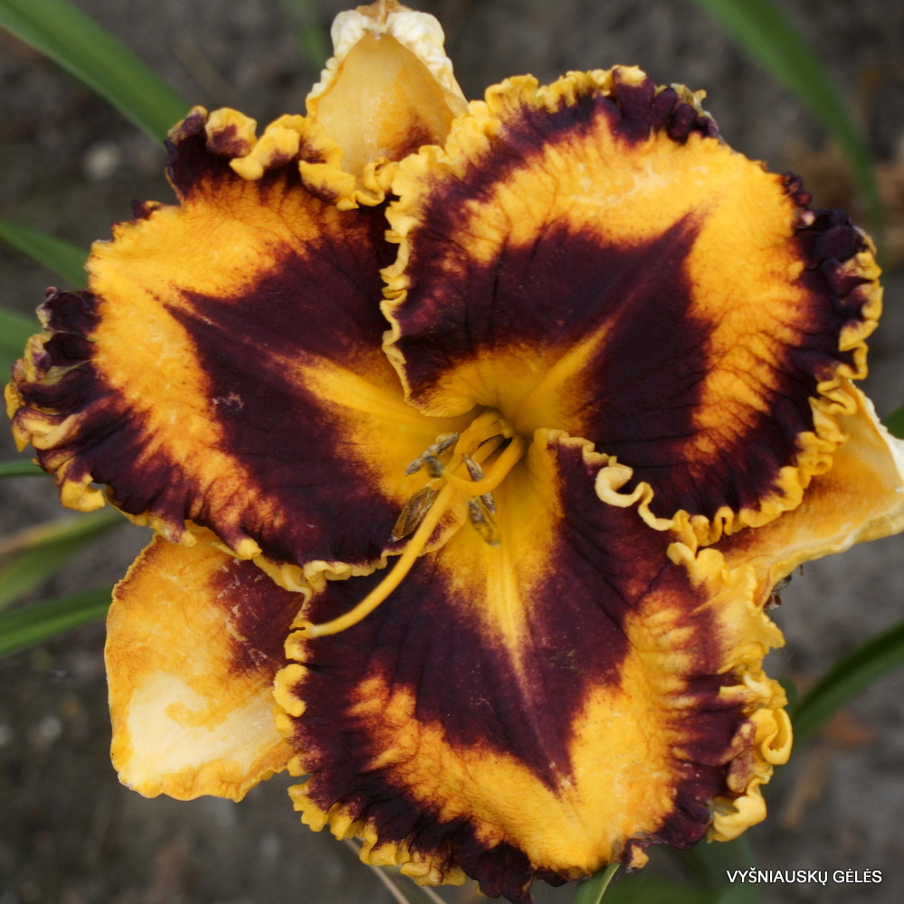 Žiedai vidutinio dydžio (15 cm skersmens) ryškiai oranžiniai su kaštonine akimi ir apvadu. A – 55 cm