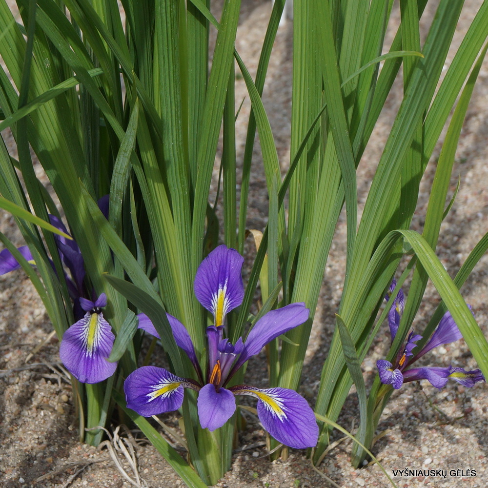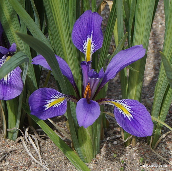 Žiedai violetiškai mėlyni prie pat žemės. Lapai 10-20 cm aukščio.