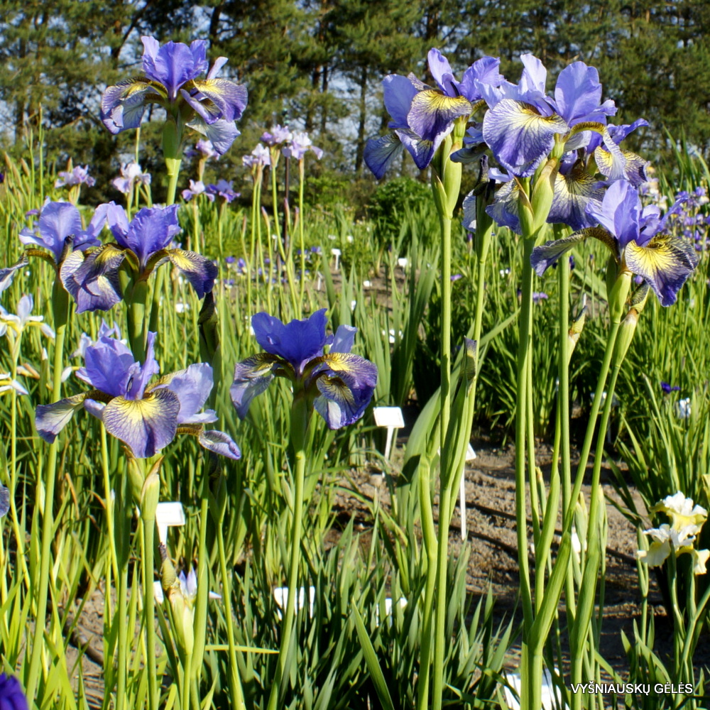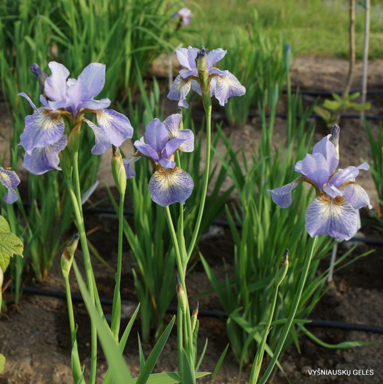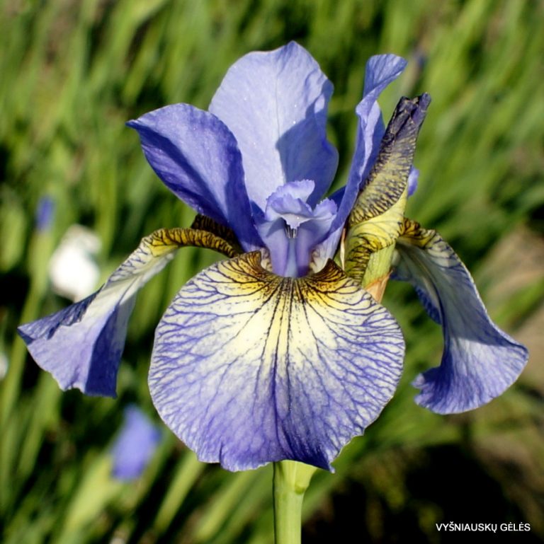 Žiedai nedideli šviesiai mėlyni su balta dėme ant apatinių vainiklapių. Pražysta birželio pirmoje pusėje. A – 100 cm