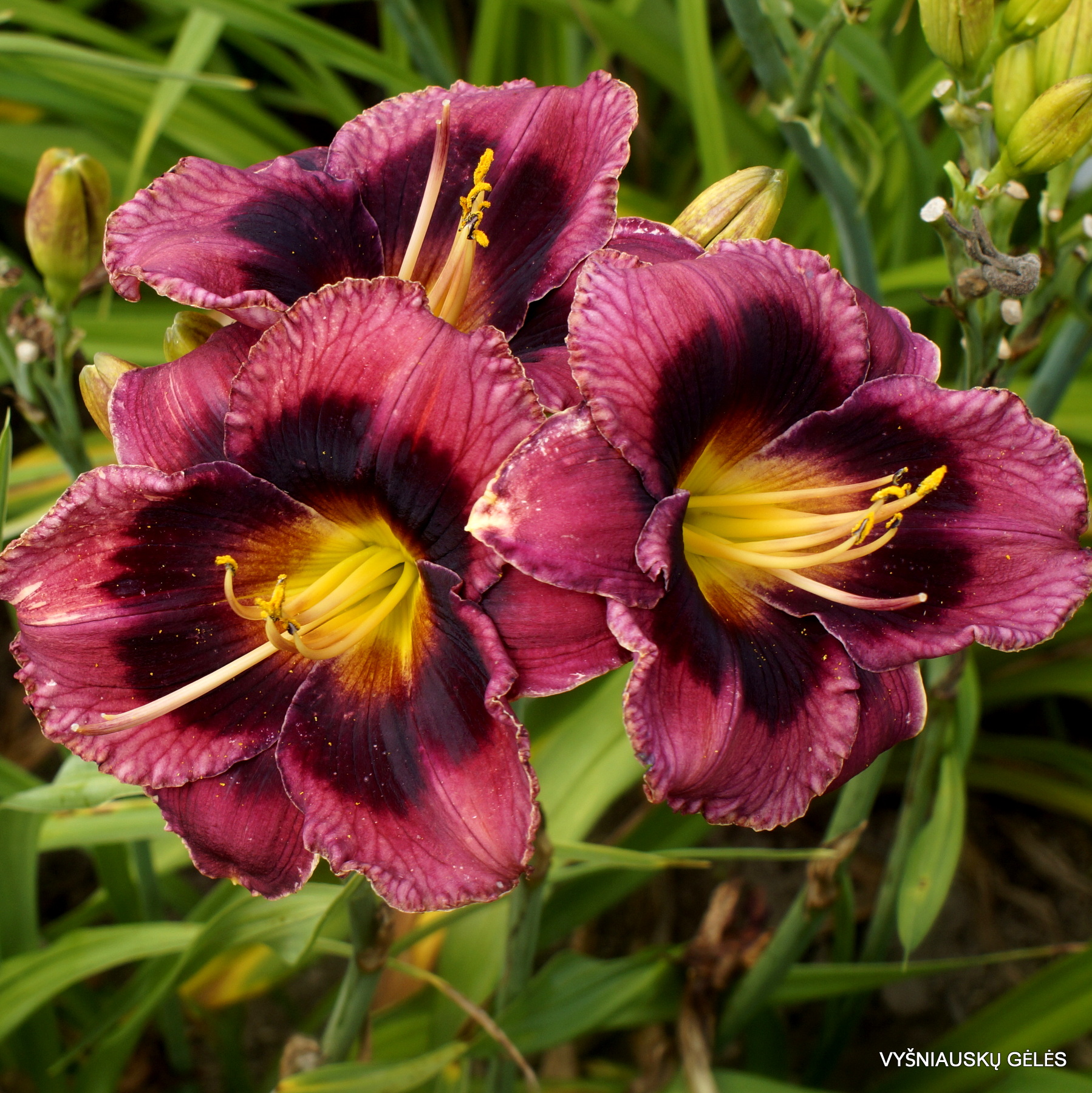 Žiedai vidutinio dydžio (12 cm skersmens) vyno raudonumo su beveik juoda akimi. A – 85 cm
