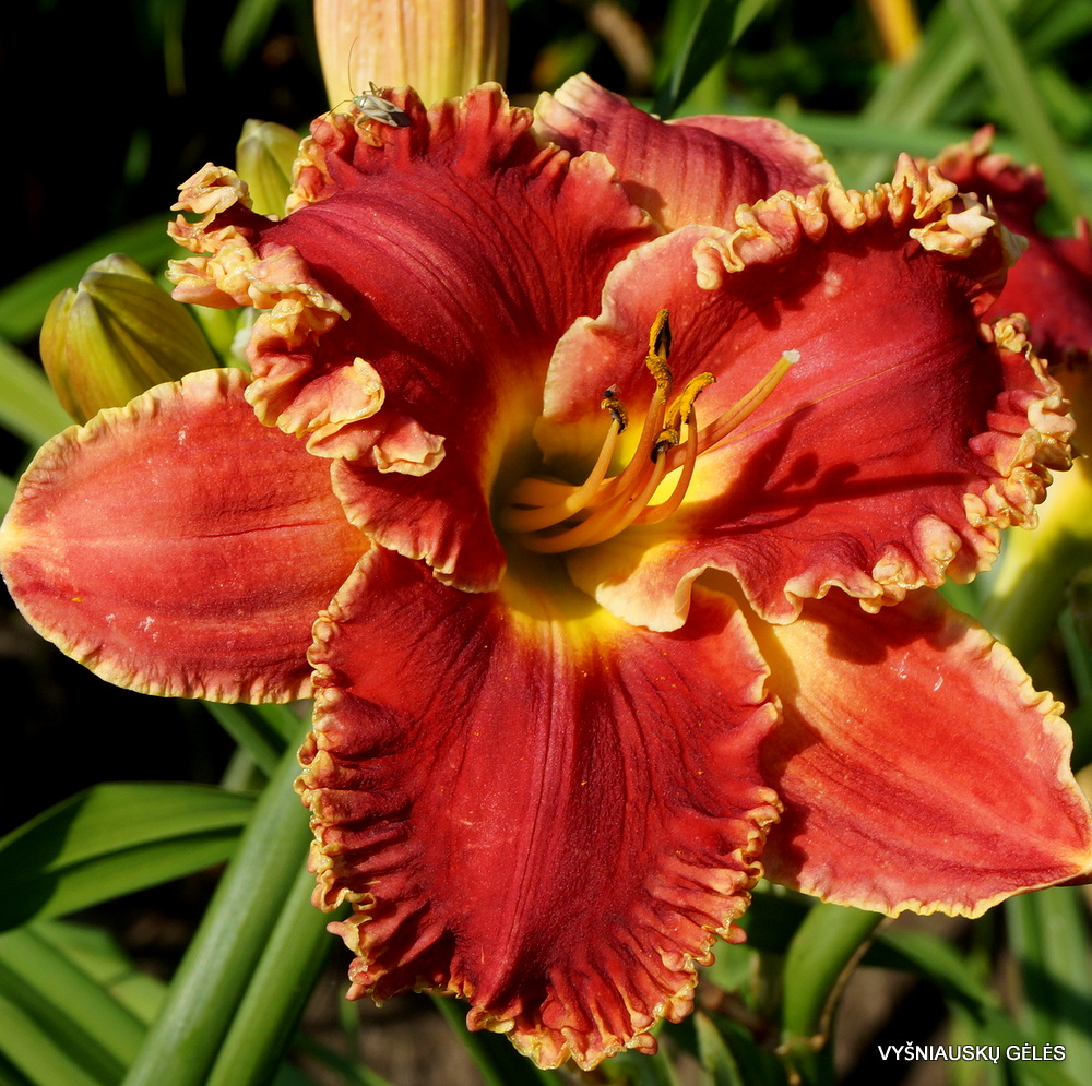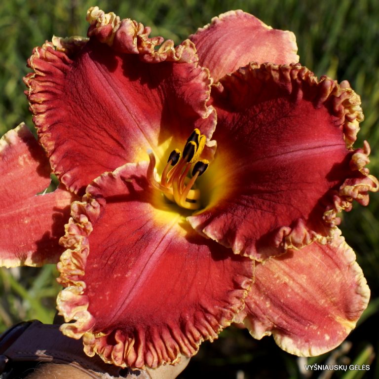 Žiedai 15 cm skersmens gražios raudonos spalvos su stipriai garbanotu apvadu.